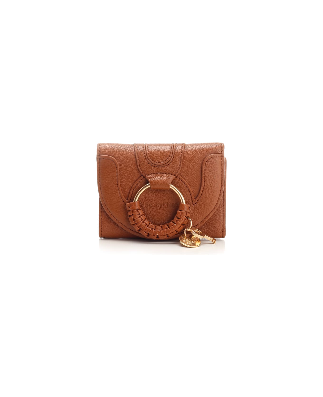 Brown "Hana" small wallet from See By Chloè in leather, cotton canvas lining, snap button closure, gold brass ring with woven motif, key ring and emblem, three card slots, three flat pockets, compartment for banknotes, inside pocket with zip.