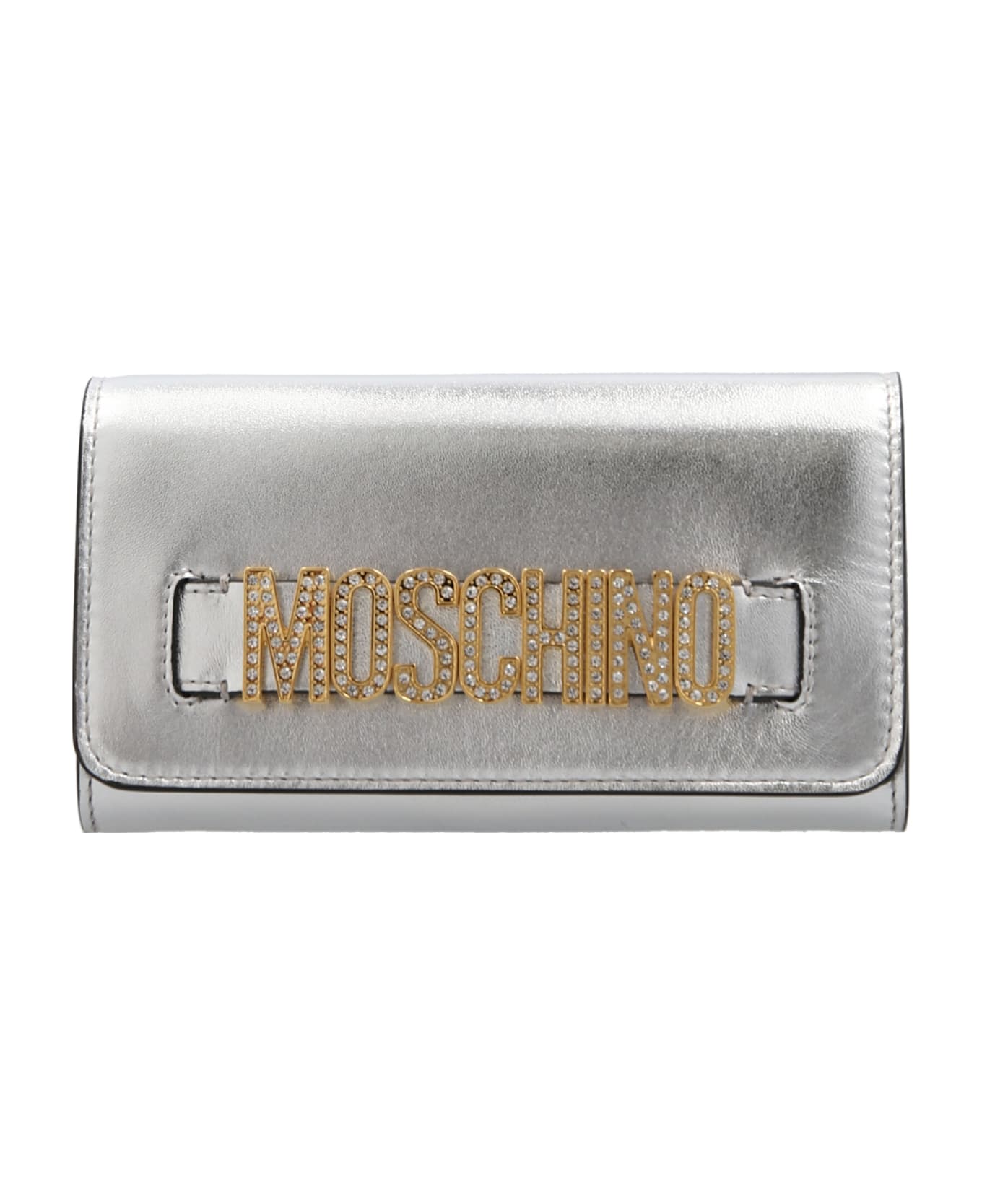 Metallicized leather wallet with logo and crystals at the front, snap button closure and a removable chain shoulder strap. Composition: 100% polyolefin