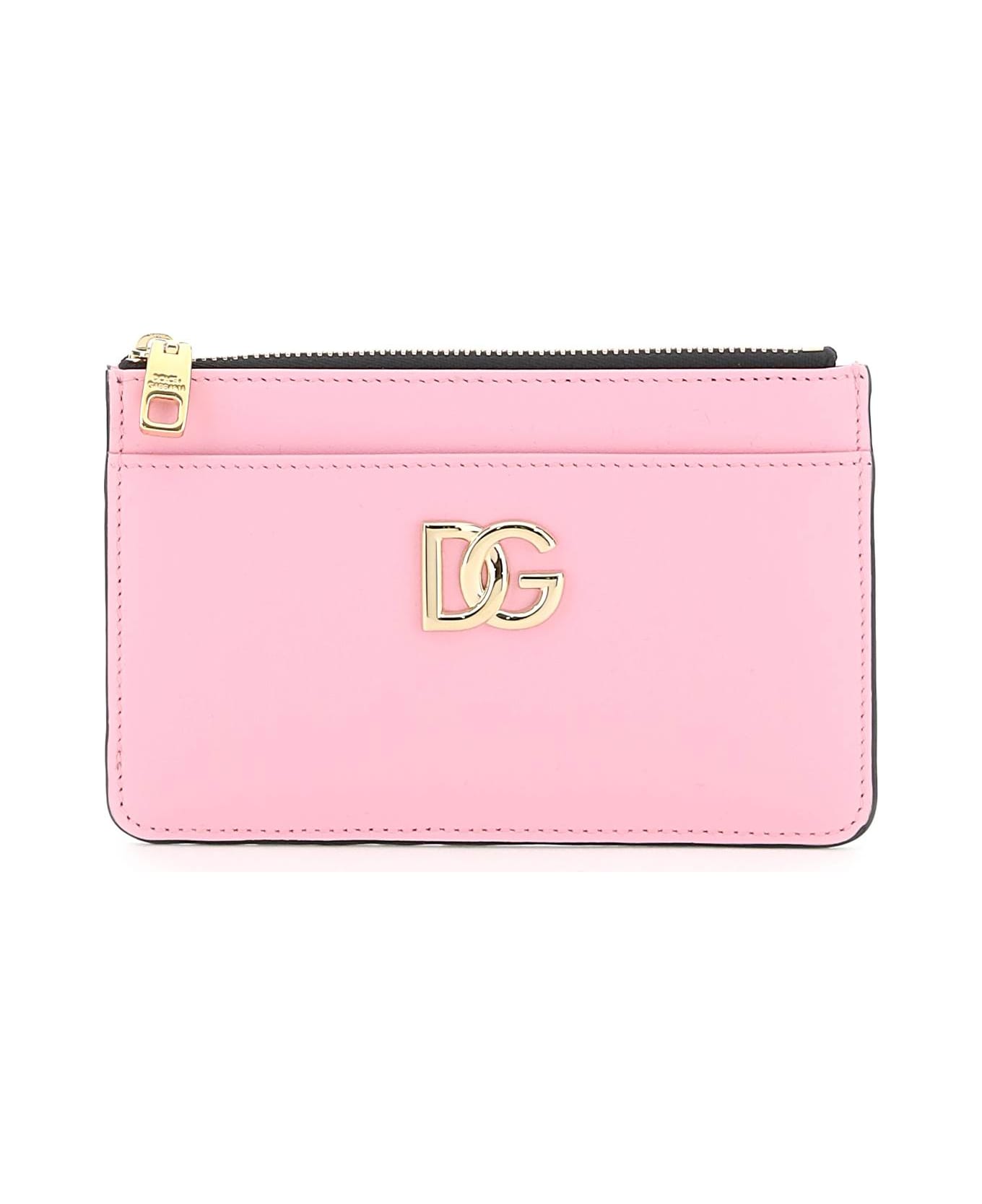 Dolce & Gabbana credit card holder made in leather with gold metal DG crossed logo. Features five credit card slots, two slit pockets and center gusseted zippered pocket.