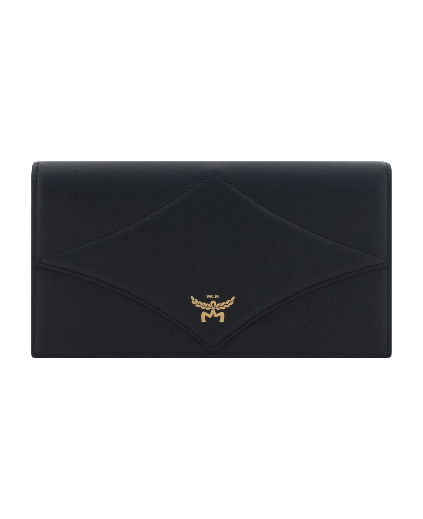 Diamond leather chain wallet by mcm featuring iconic brand monogram printed in contrast on front, magnetic flap closure, removable chain strap, interior card slot, bill compartments and zipper pocket.