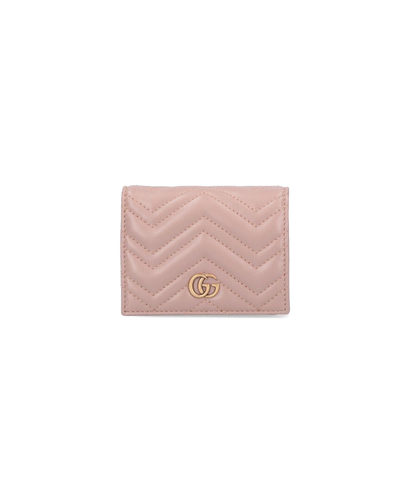 Gucci GG Marmont Small Wallet, pink matelassé leather, chevron pattern, back quilted GG detail, Antique gold-colored finishes, Five internal card slots, Two flat pockets, Zip pocket, One banknote compartment, Automatic closure. - 100% leather - h 8. 5 x w 11 x d 3 cm