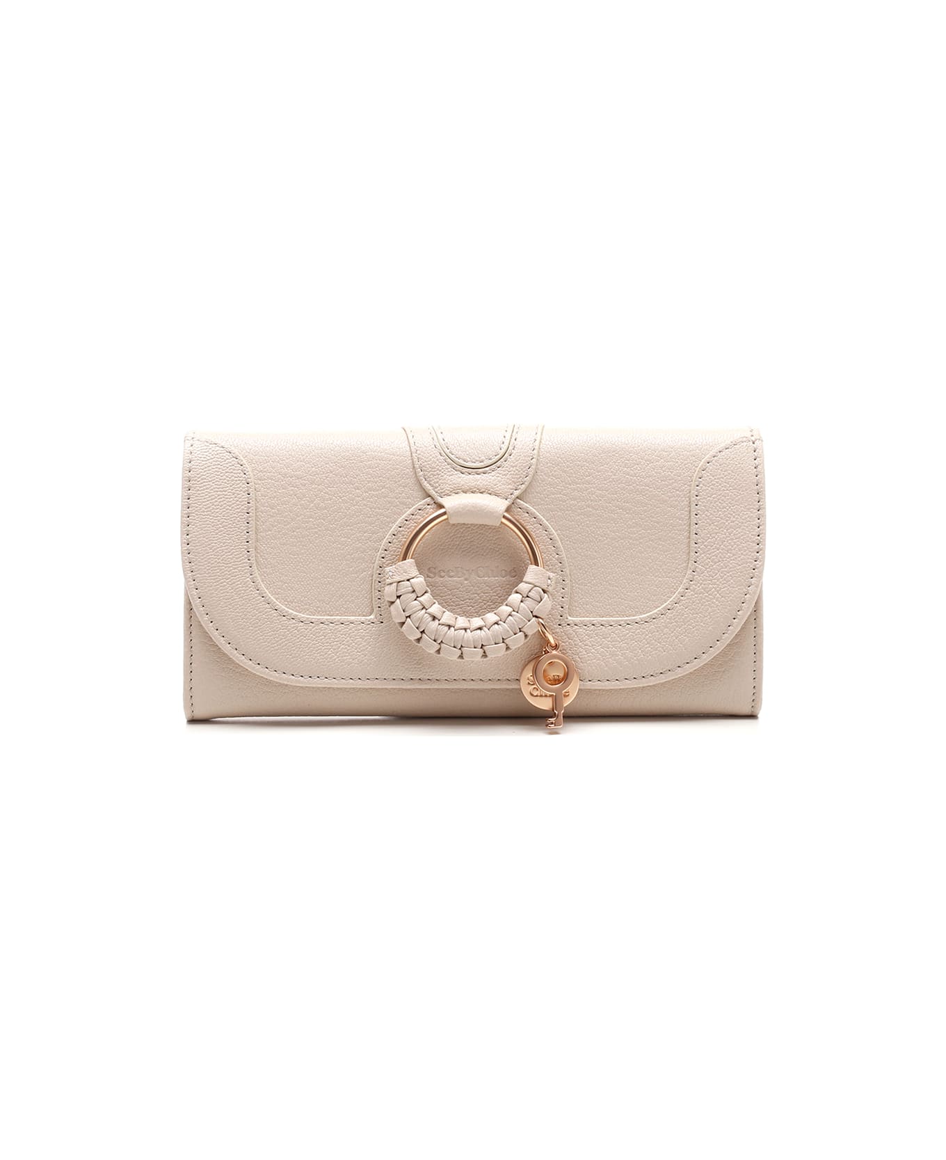 'Hana' continental wallet in light beige grained leather from See by Chloè. Snap button closure, gold brass ring with woven pattern. Inside 8 compartments for cards, 2 compartments for banknotes, a central pocket with zip.