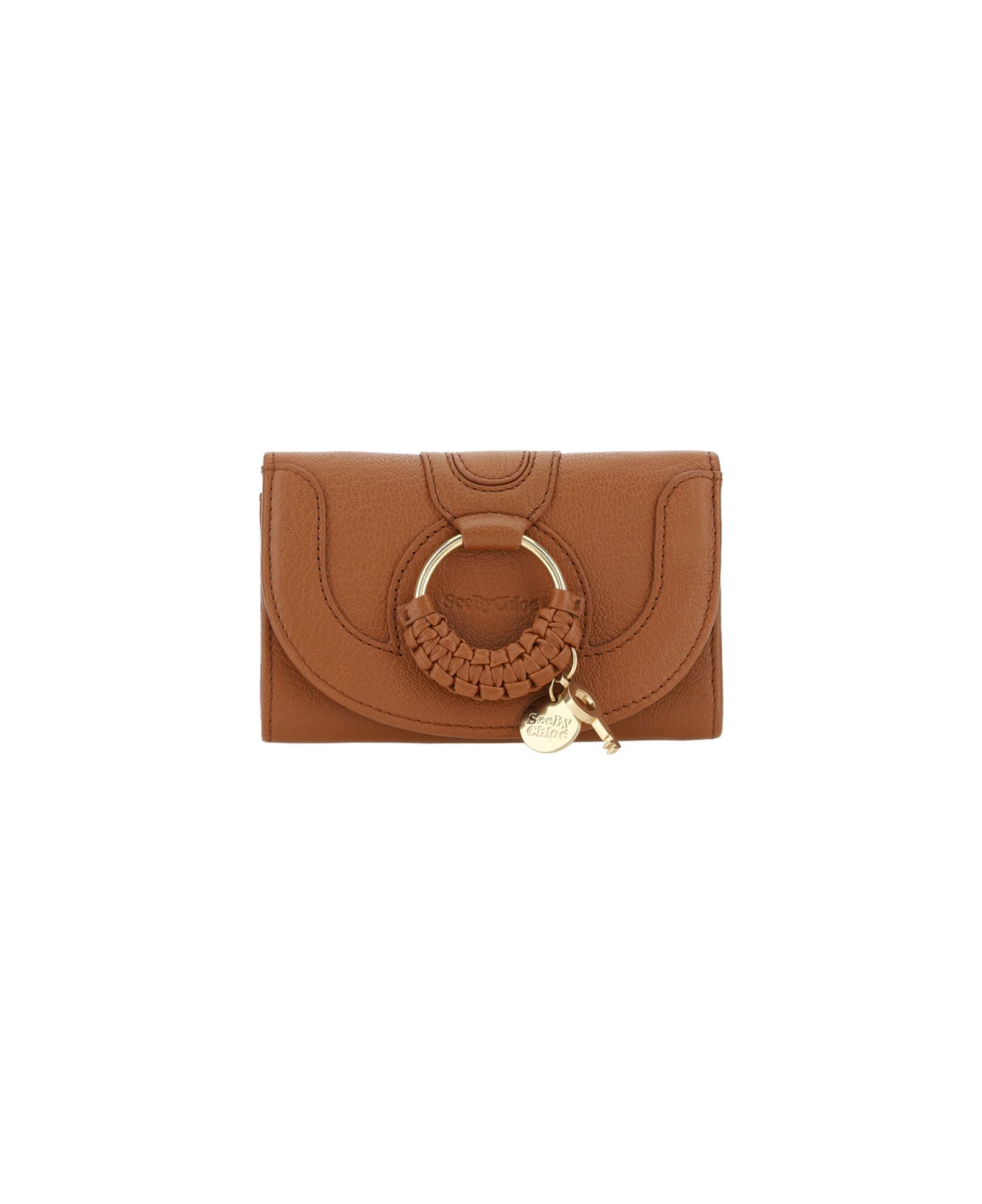 Calfskin hana sbc wallet by see by chloé, flap with push button closure, decorative and gold-coloured metal ring with braided leather detail and logo charms on the flap, embossed logo on the flap, rose gold-coloured metal details, partly engraved, two bill compartments, two open pockets, twelve card slots, one zippered coin pocket, embossed logo inside.