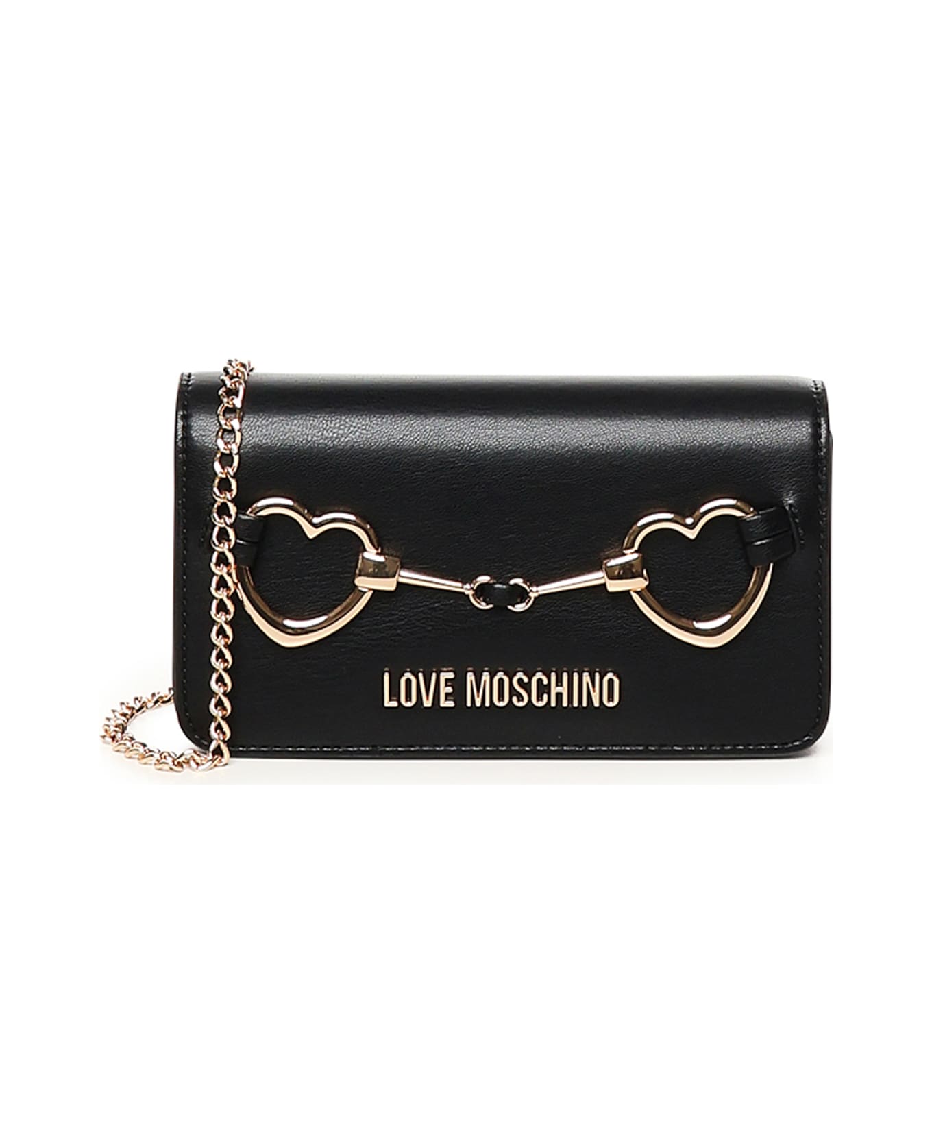 -Gold-plated decorative element with double heart -Gold-plated lettering logo applied on the front -Removable chain shoulder strap for shoulder portability -Magnetic closure-Internal zip pocket -Measurements: 20 x 11 x 3 cm -Color: Black