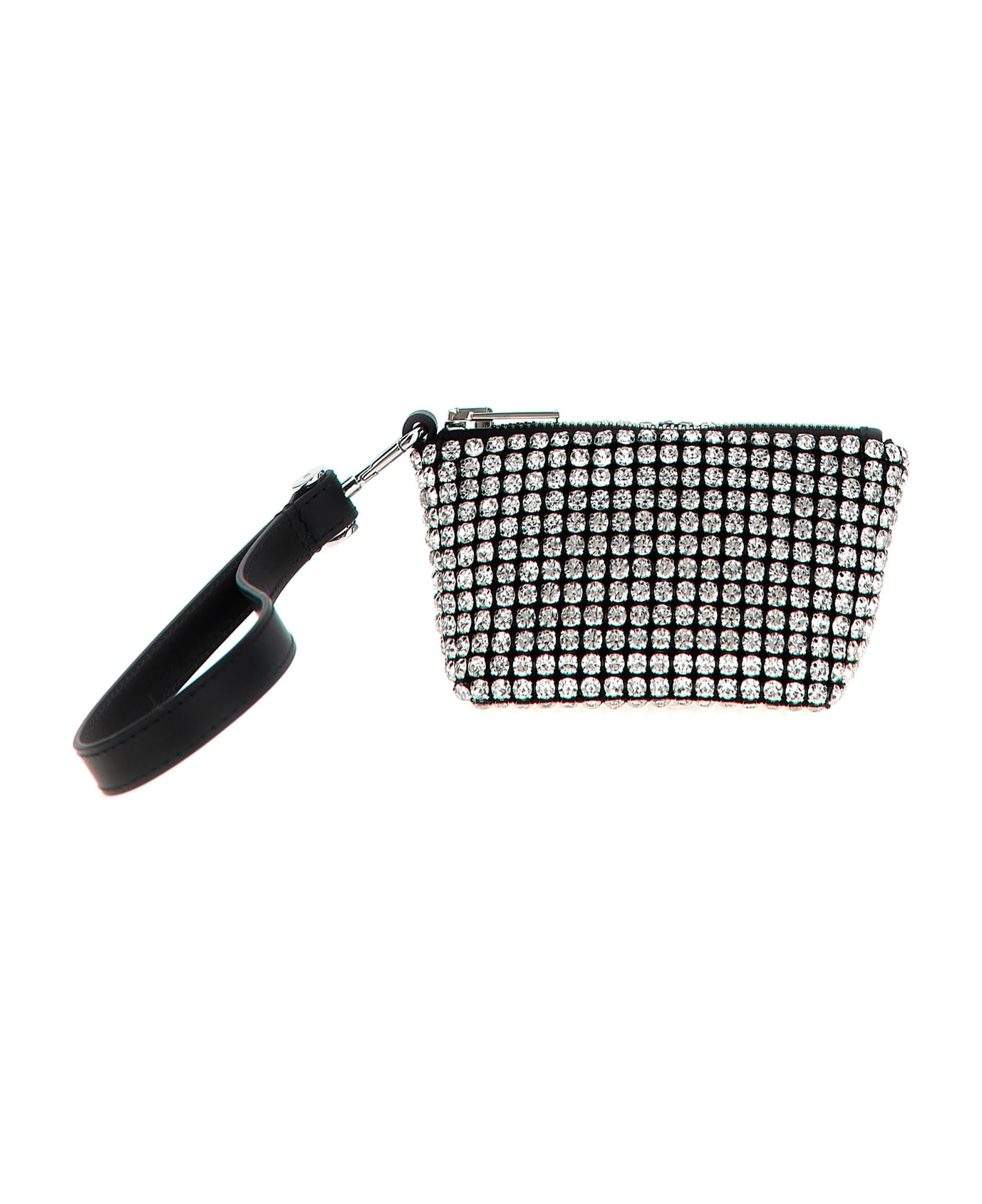 Heiress' fabric coin purse with all-over crystals, zip closure, removable leather details and handle, and inner metal keyring.