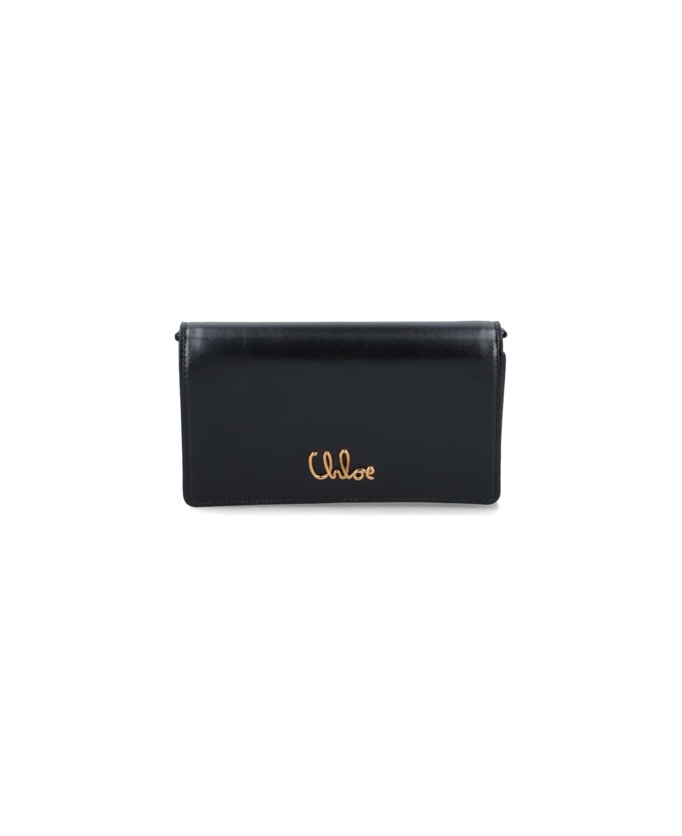 Chloé 'Iconic' chain wallet in black leather with gold metal chain shoulder strap, magnetic button flap closure, eight inner card slots, one inner flat pocket, one inner central zip coin pocket, two separate inner bill compartments. Composition: 100% Calf Leather
