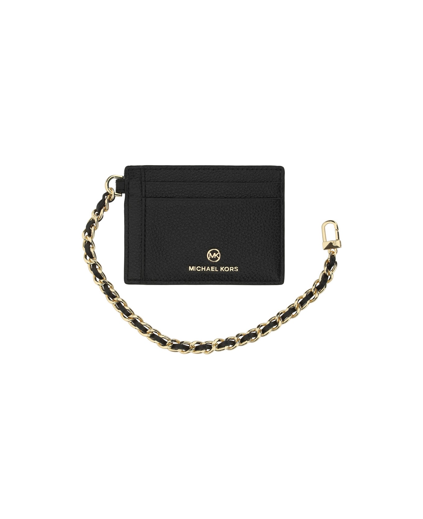 Jet set charm card holder by michael kors, card slots on front and back, badge holder slot on back, gold chain with snap hook, iconic brand monogram printed in contrasting pressure on front.