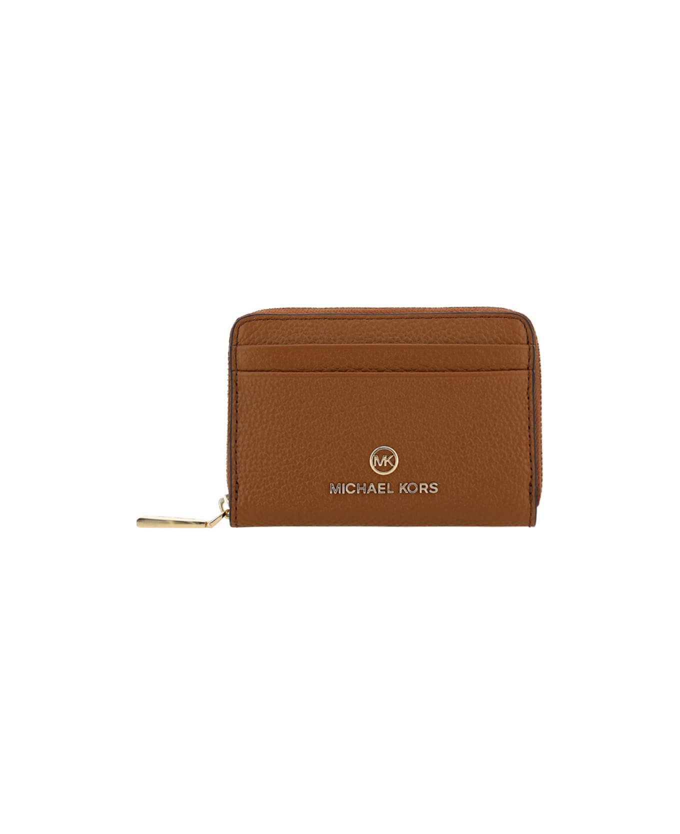 Calfskin jet set charm wallet by michael kors, grained leather design, top zipper closure, card slots on front and back, iconic brand monogram embossed on front, double bill compartment inside, zippered interior coin compartment.