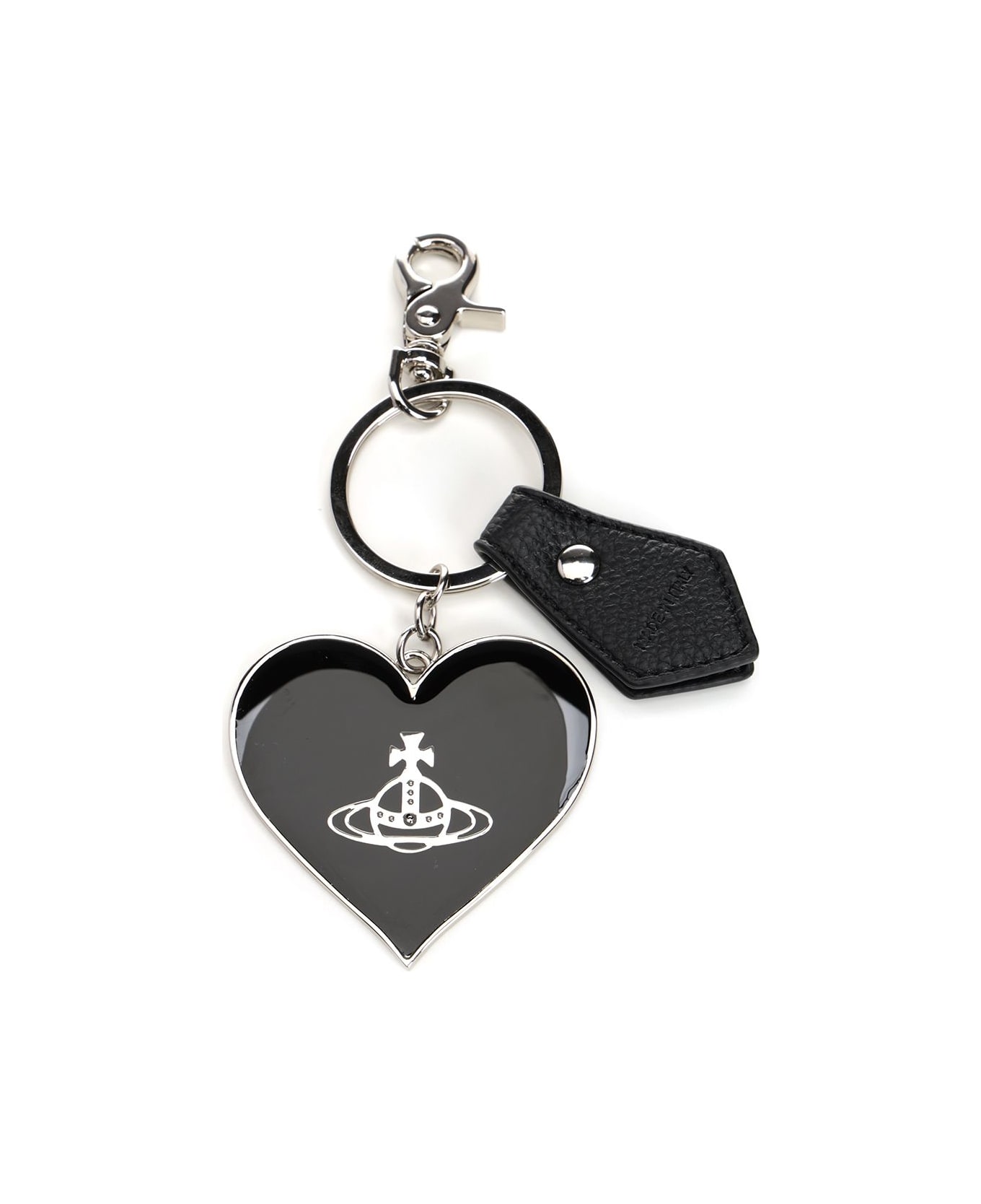 Vivienne Westwood 'Mirror Heart Orb' key ring featuring a lobster clasp, a PU leather tab and a heart charm, the reverse of the charm features 'Vivienne Westwood', while the front features the 'Thin Line Orb' plaque, an interpretation of the house's iconic emblem.