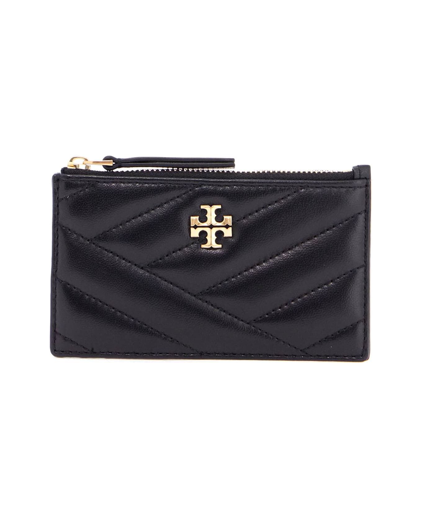 The Kira card holder by Tory Burch is made of soft chevron quilted leather with the classic Double T in gold metal. It features a top compartment with zipper closure and four slots on the back.