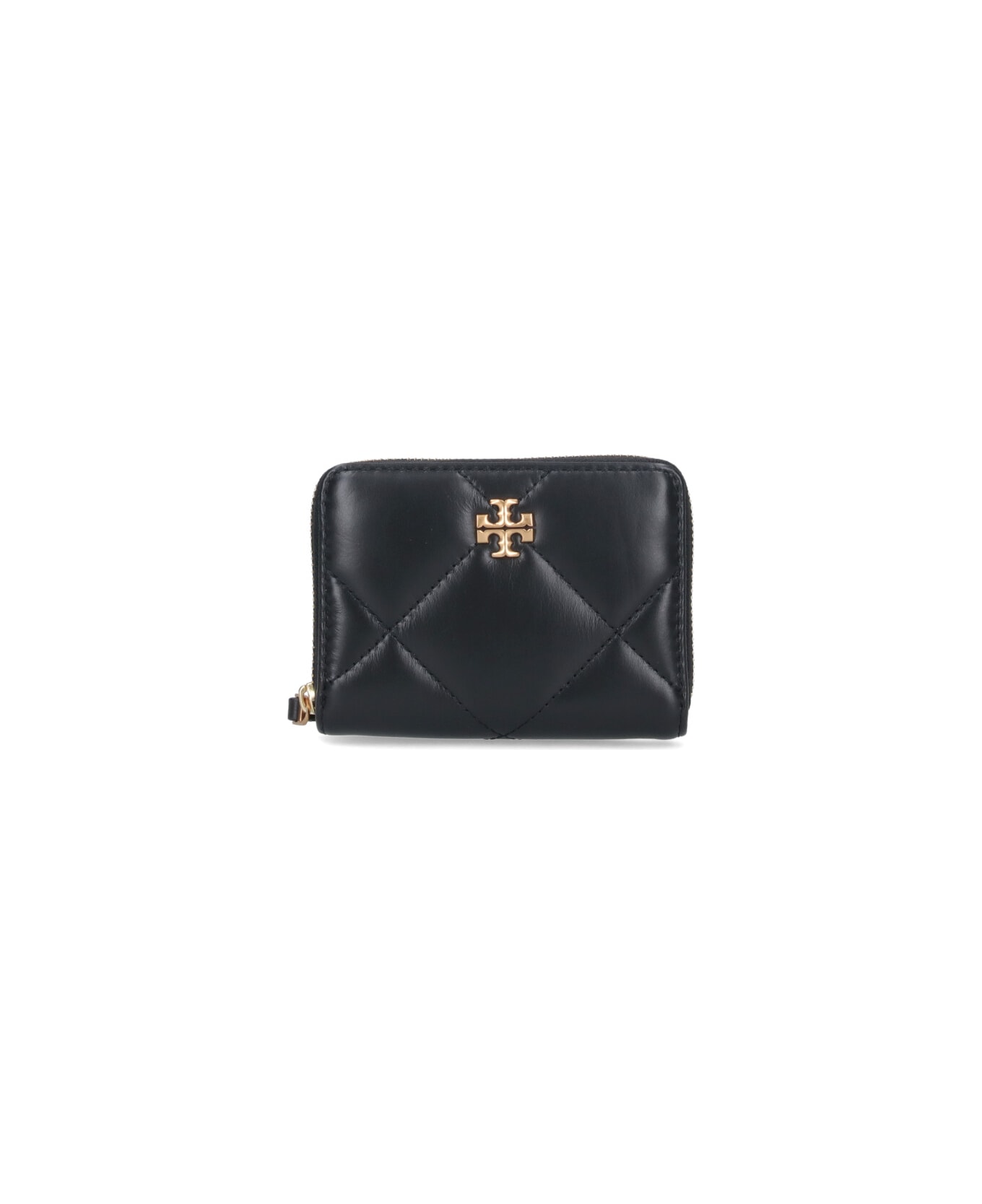 Tory Burch 'Kira' small black leather zip wallet with diamond quilted pattern, zip closure, double gold metal 'T' logo on the front, four inner card slots, one inner central zip coin pocket, two separate inner bill compartments.
