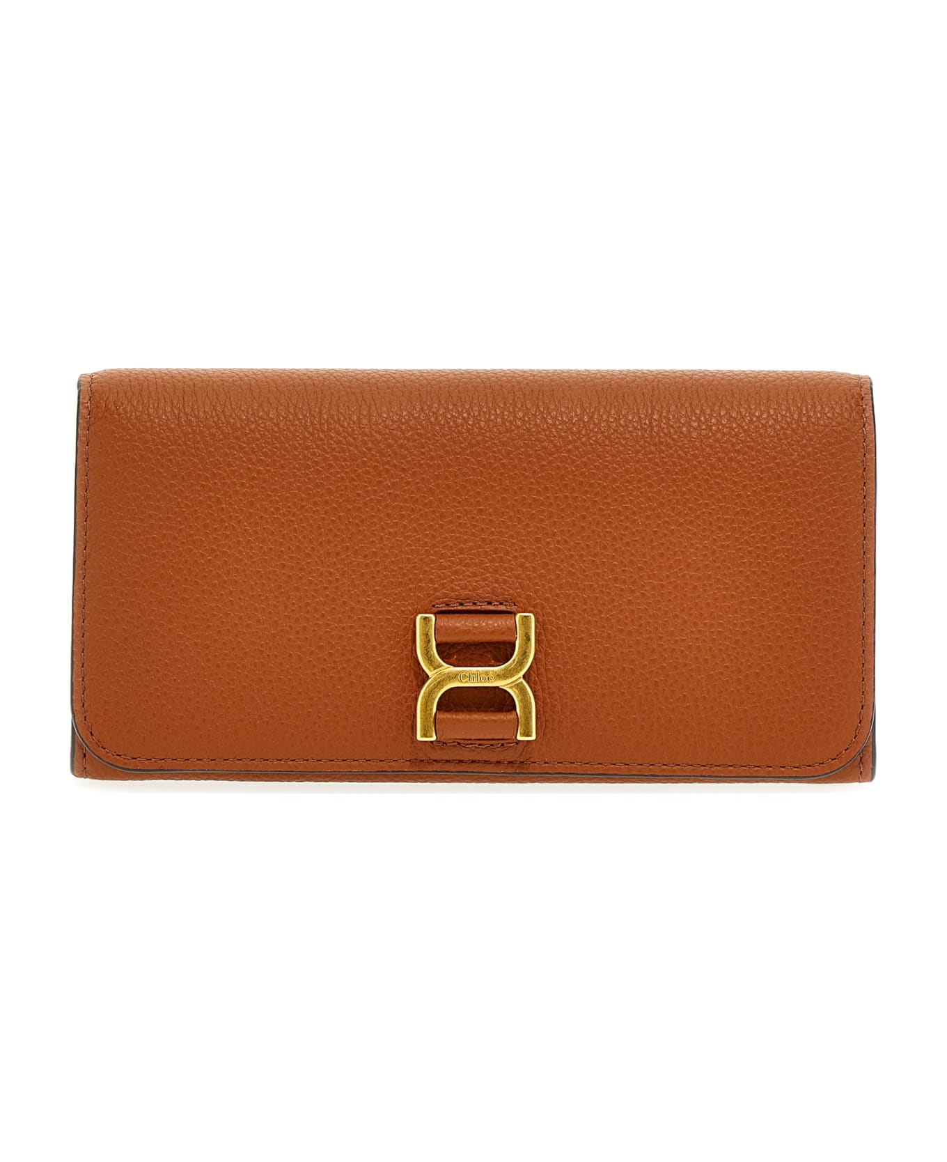 Marcie' leather wallet with button closure and a front metal logo application. Composition: