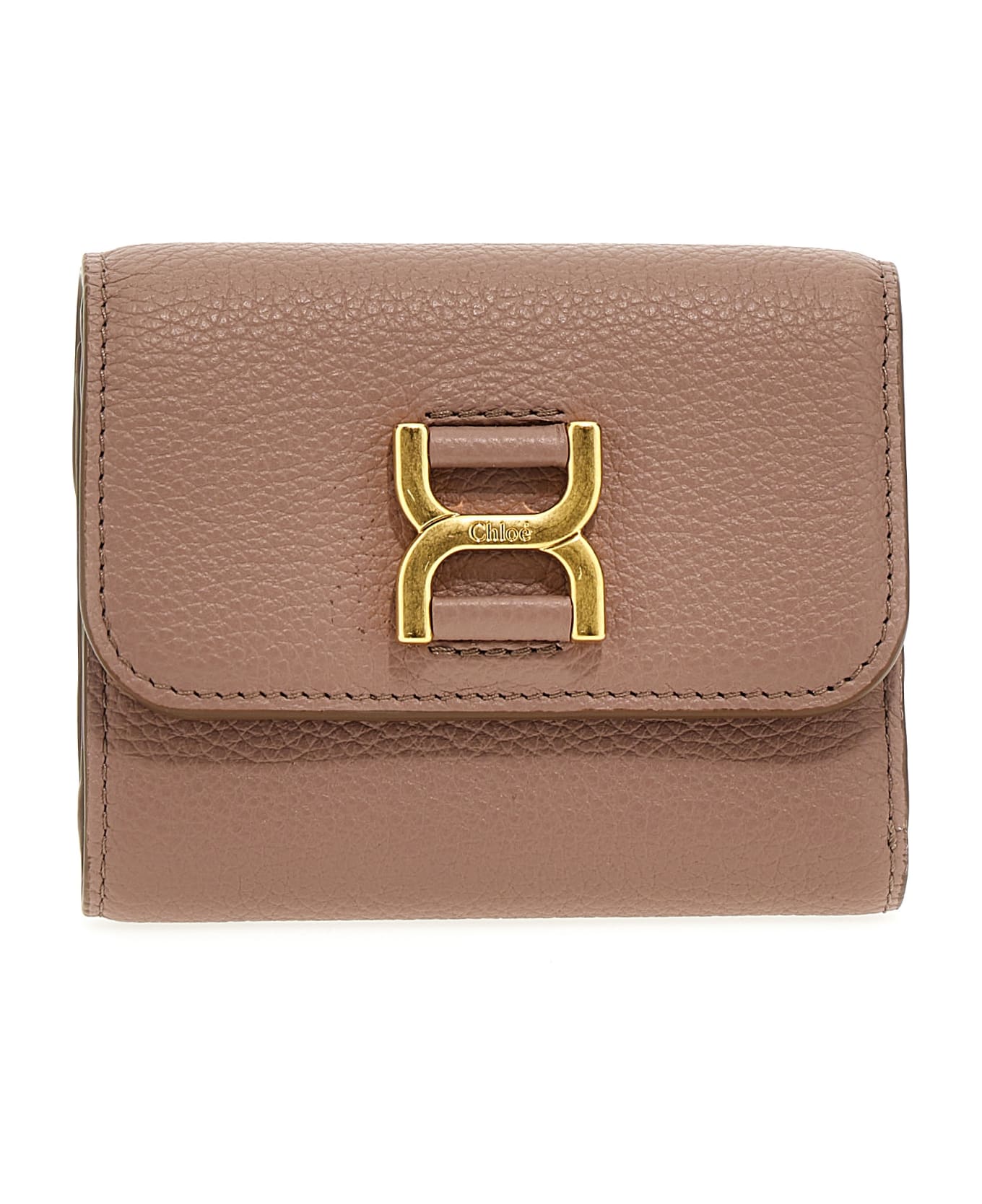 Marcie' leather wallet with button closure and a metal logo appliqué at the front. Composition: