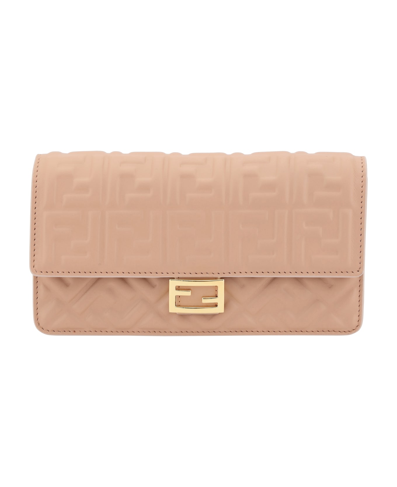 The matisse chain wallet by fendi is an elegant and practical accessory. made of leather, it features a gold chain for carrying it by hand, adding a touch of luxury. the front closure is with magnetic flap, while the three-dimensional plaque with the brand's iconic ff logo is a distinctive detail. the padded design, with the all-over embossed repeated logo, gives a sophisticated and modern look, perfect for those seeking elegance and functionality.