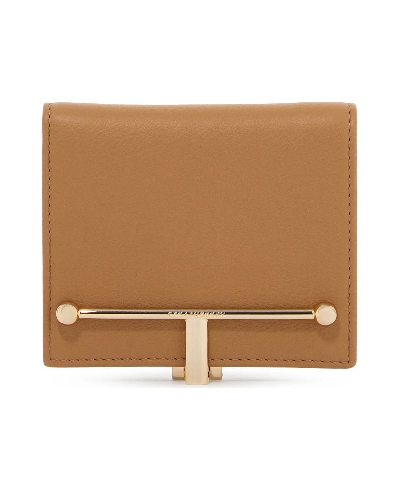 The Melville Street bi-fold wallet by Strathberry is handcrafted in smooth leather and adorned with the brand's signature bar closure. The interior features a bill pocket, a slip pocket, three credit card slots, and a zippered coin compartment.