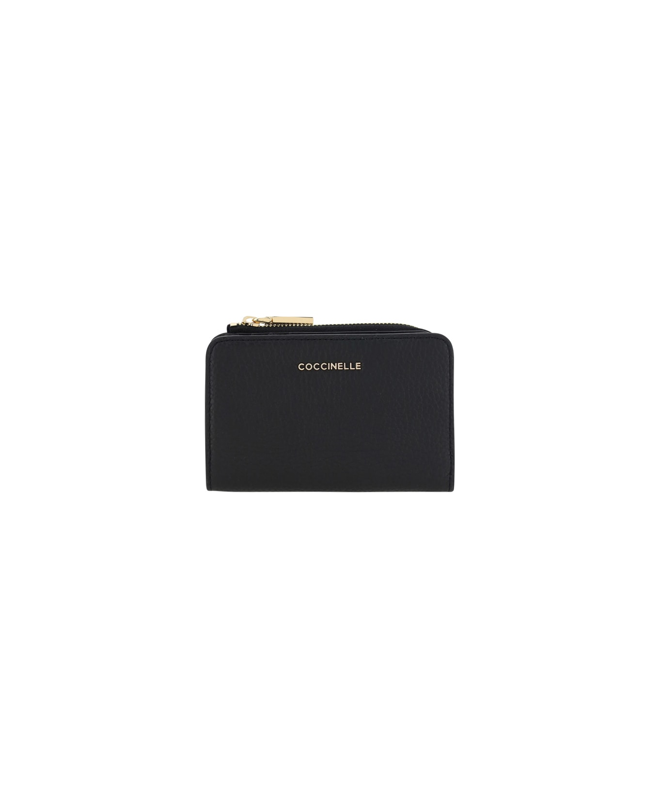 Calfskin metallic soft wallet by coccinelle, interior snap-button closure, zippered coin compartment for closure, banknote compartment, interior card slots, iconic brand monogram plaque applied to front.