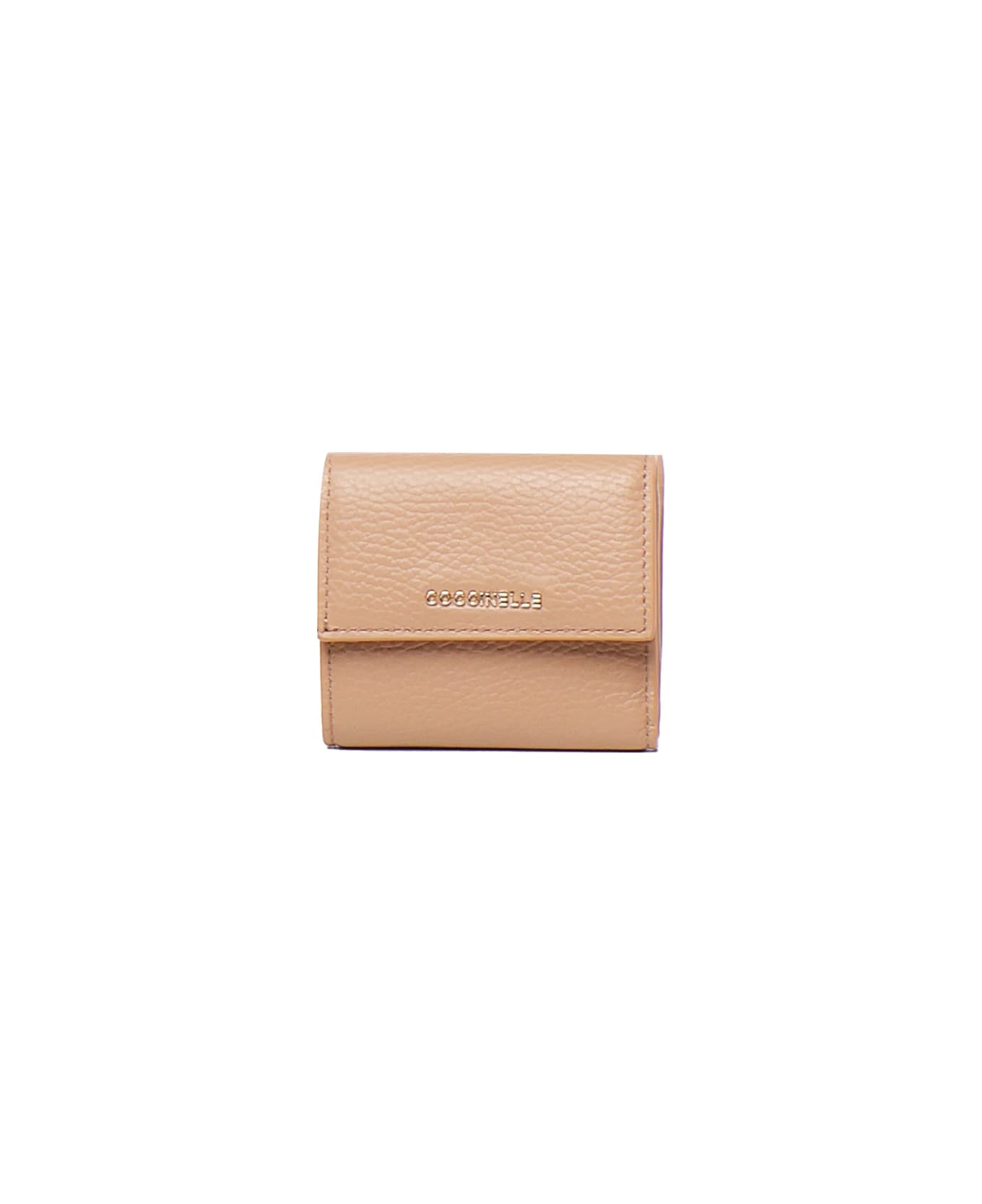 -Small wallet -Made of elle with grain -Money purse zippered back -Five card holders -Banknote holder -Two interior compartments -Light gold galvanic -Metal lettering logo -Measurements: 10 x 8 cm -Color: Nude