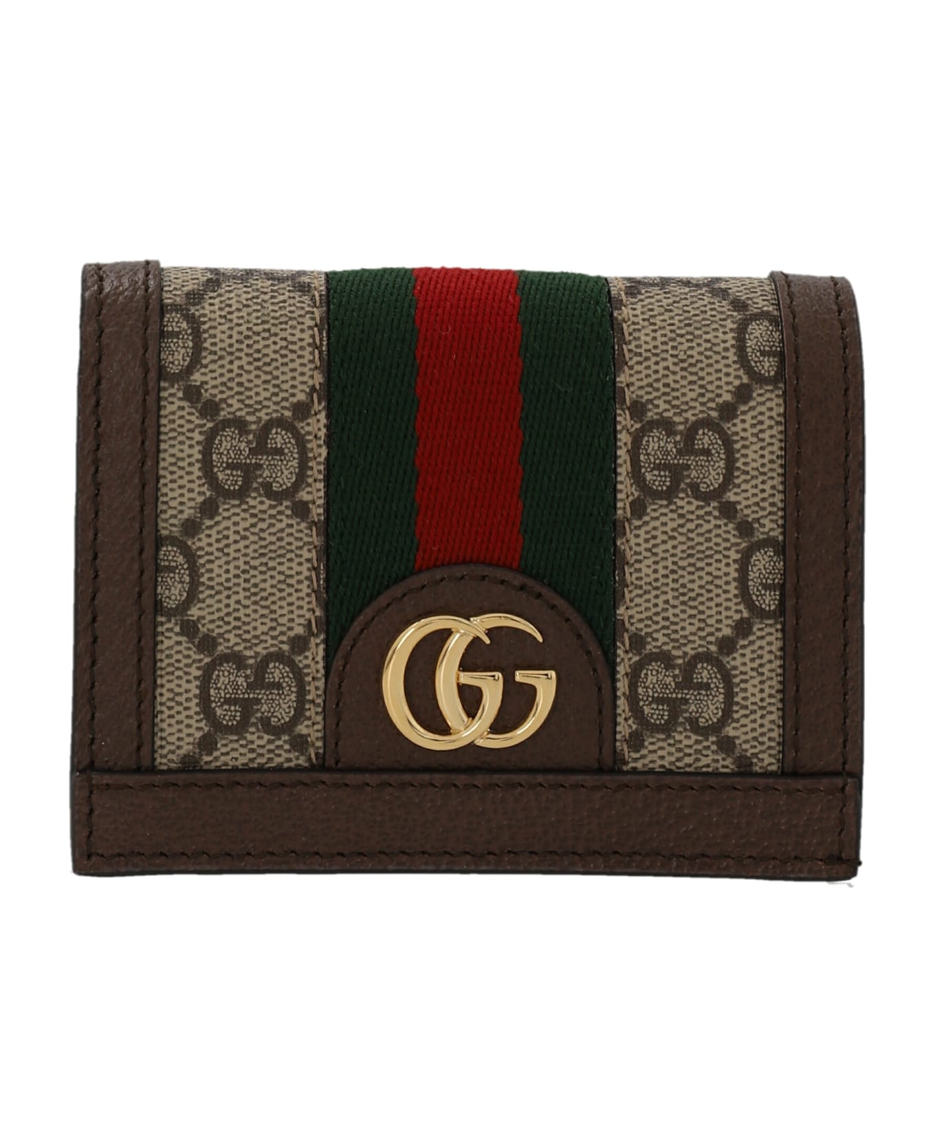 'Ophidia' wallet in beige and ebony GG Supreme fabric, a material with a reduced environmental impact, featuring brown leather trimming, antiqued gold hardware, green and red web, a double G, five card slots, a compartment for banknotes, an inner zipped pocket, and a snap button closure. Introduced for the first time in the 1970s, the GG pattern evolves from the original Gucci diamond motif of the 1930s and is now a hallmark of the Maison.