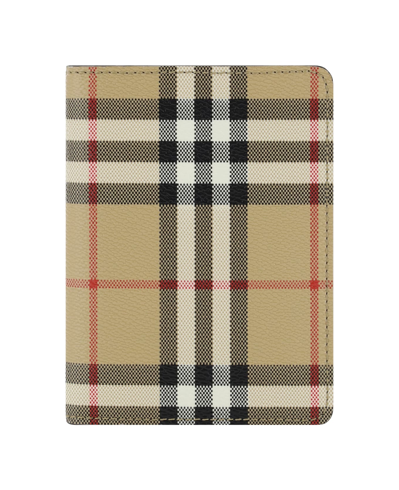 Passport holder by burberry, iconic check pattern all-over printed brand archives,contrasting monogram printed throughout, interior document slot, interior card slots with contrasting stitching. .