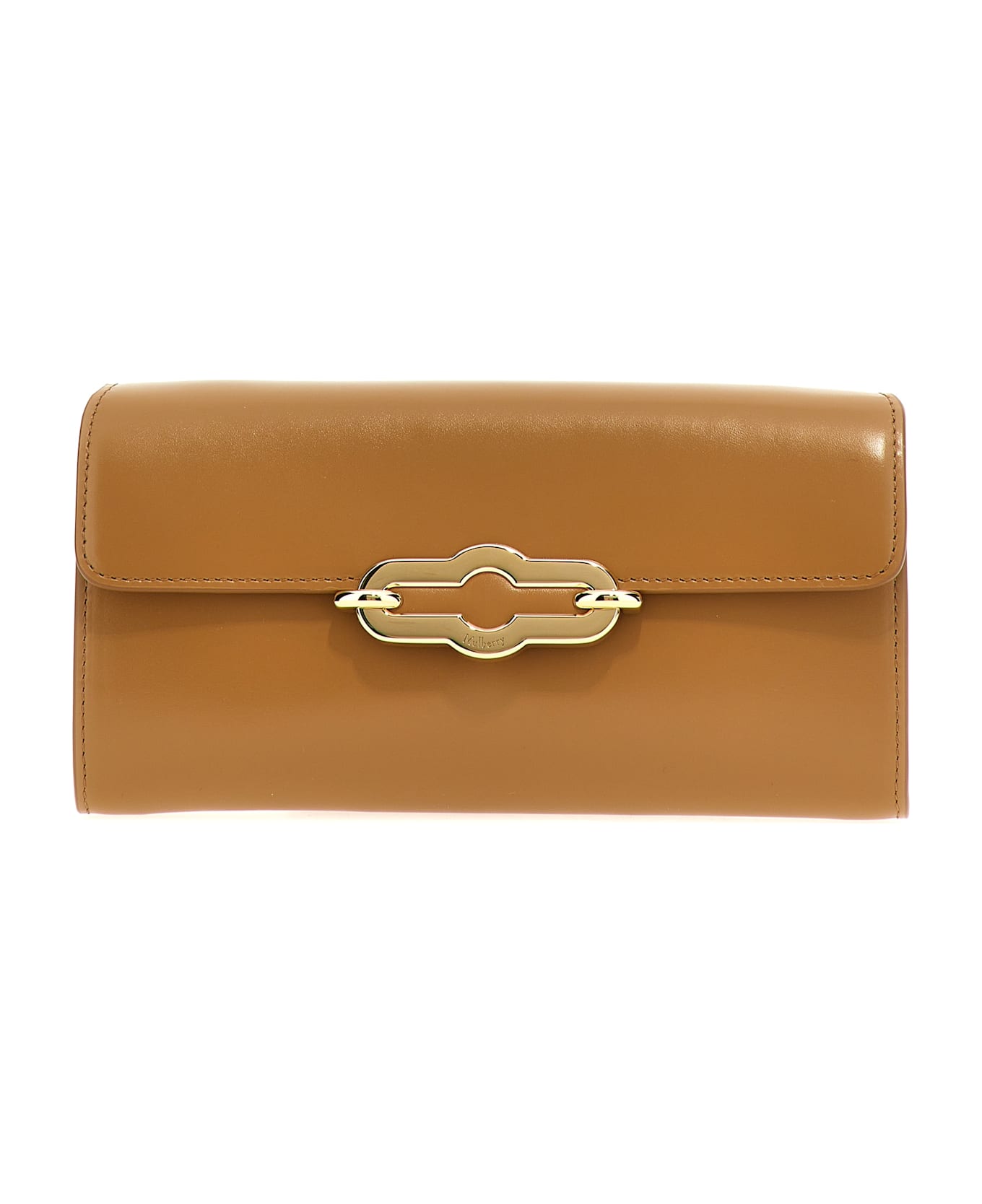 Leather wallet on chain, snap flap closure with front metal 'Pimlico' padlock decoration, adjustable and removable shoulder strap.