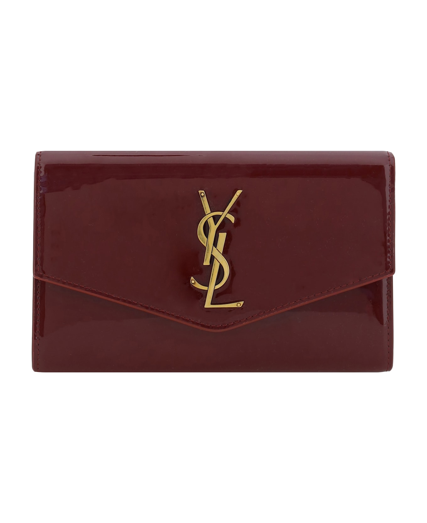 Leather pouch bag by saint laurent, shiny leather design, a magnetic front closure, an applique brand iconic logo plaque on the front, a chain shoulder strap, and an interior with card slots. Composition: 100% % Calf Leather Bos Taurus
