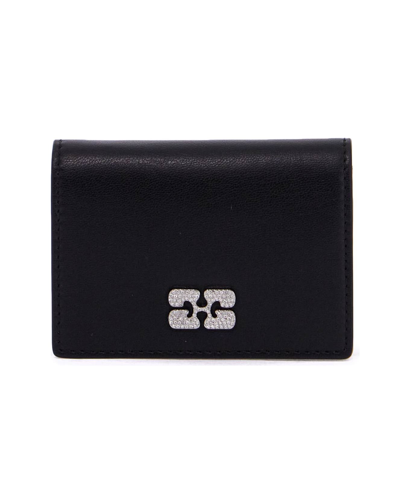 The Ganni card holder is made of recycled leather and features a metal Butterfly logo embellished with crystals on the flap. It has a snap button closure, one main compartment, two slots, and an additional one on the back. The holder also comes with a keychain ring and charm.