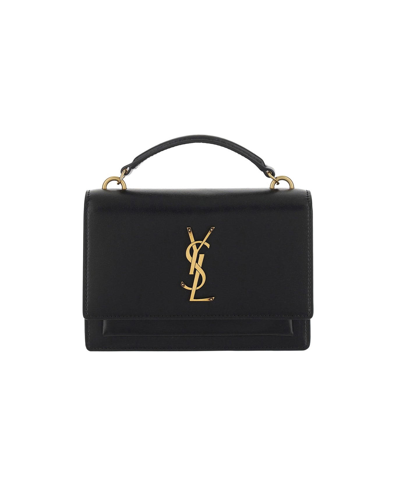 Nero/nero Sunset Shoulder Bag. from Saint Laurent Black leather sunset shoulder bag by saint laurent, magnetic flap closure with golden brand logo lettering, top leather handle, removable and adjustable shoulder strap, open pocket under the flap, slots for cards, zippered central compartment.