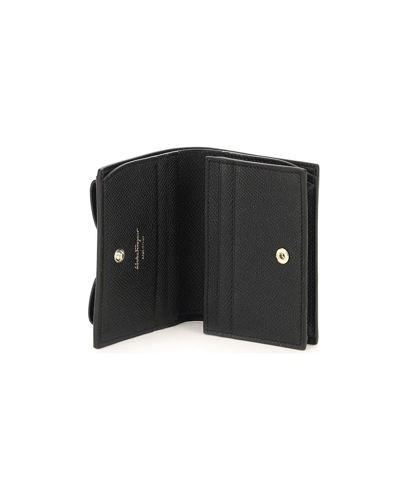 Vara compact wallet in grained leather by Salvatore Ferragamo with Vara Bow applied and gold-finish logoed plate. Leather and fabric interior with one bill compartment, four credit card slots and one zippered gusset pocket. Gold-finish metalware. Composition: 100% Leather