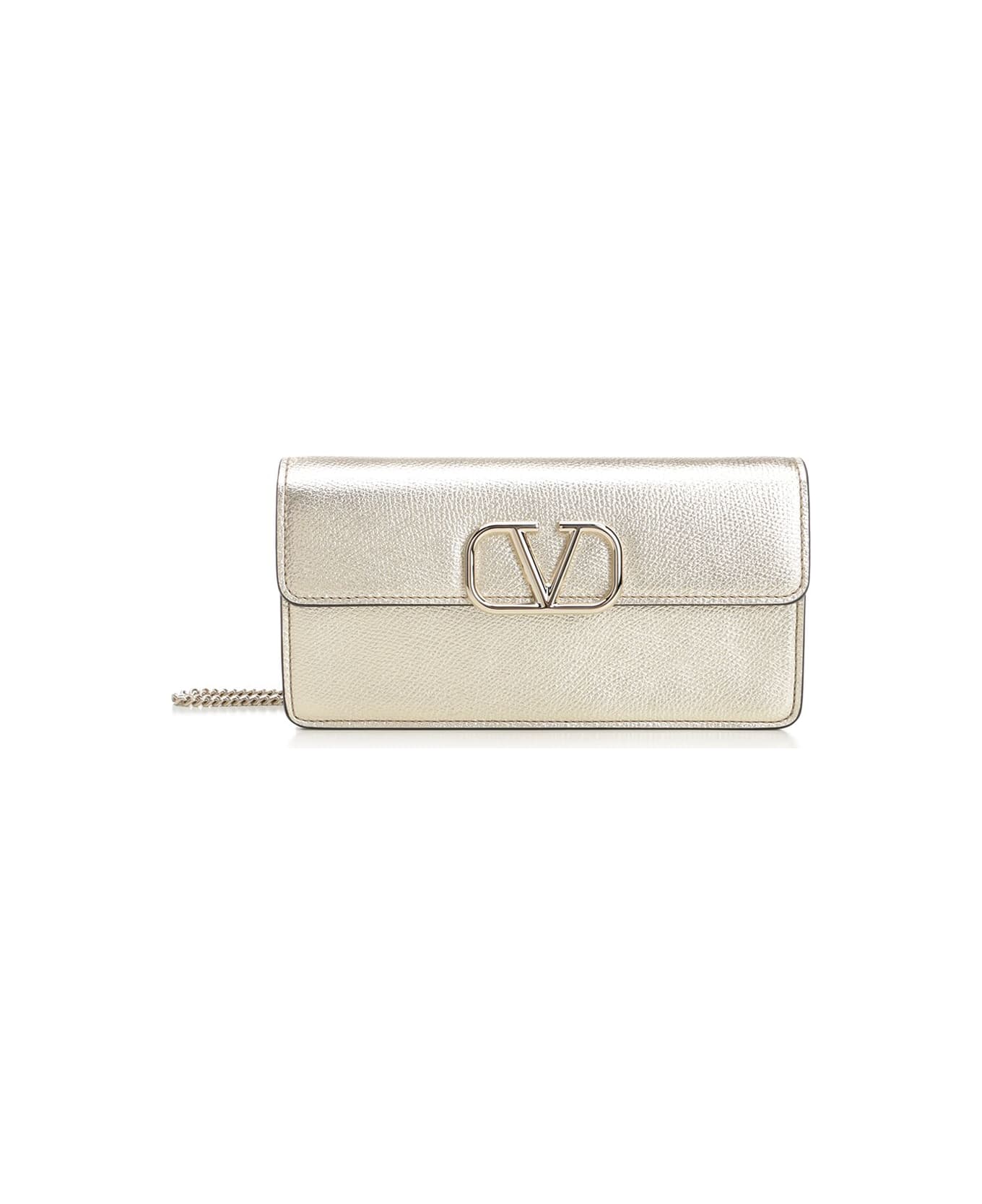 Wallet with removable chain by Valentino Garavani, in metallic grained calfskin. Metallic VLogo Signature. Magnetic closure. Palladium-finish logo and metal parts. Two compartments divided by a zip pocket. Eight card slots and a flat pocket. Composition: VT100%