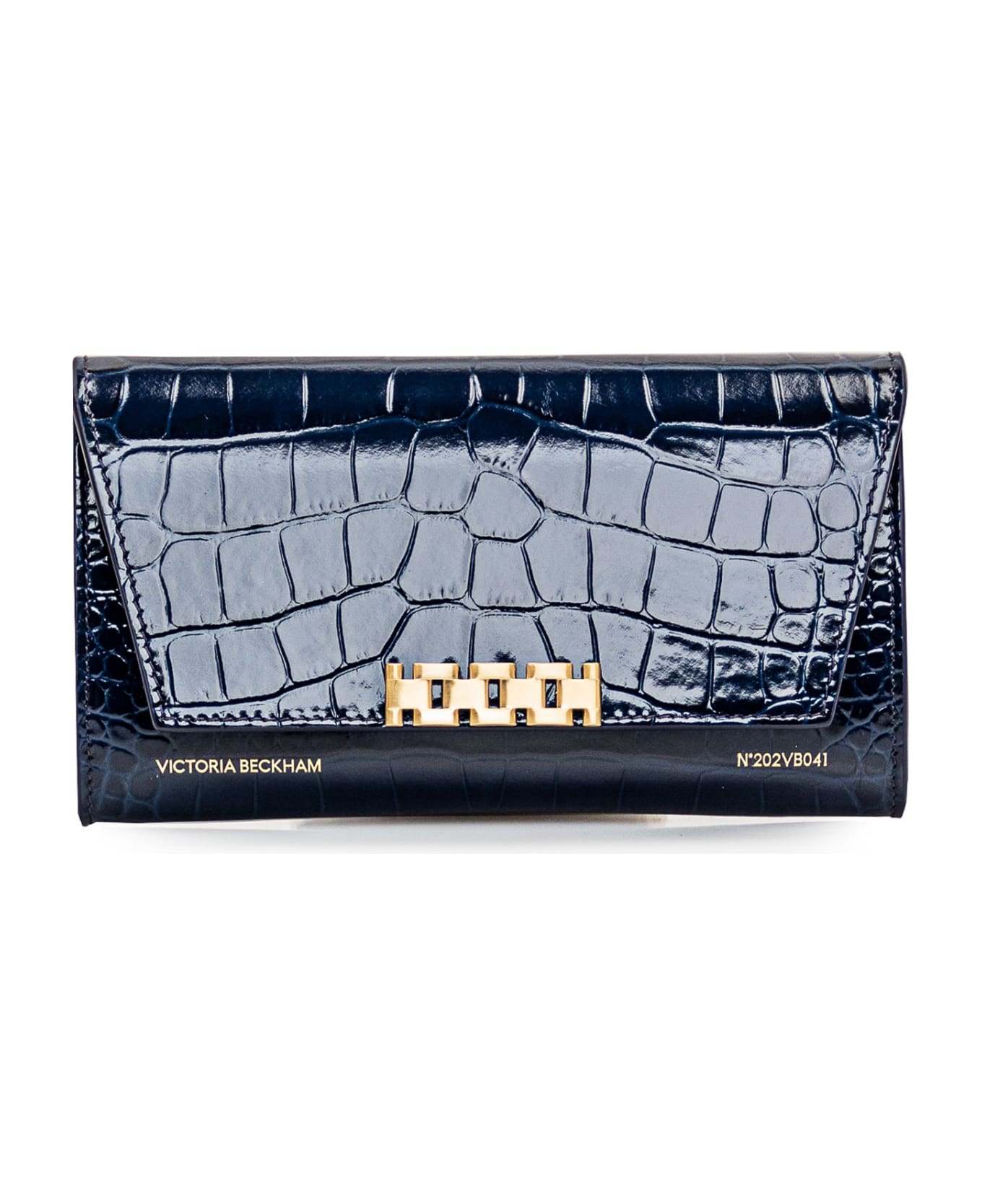 Blue leather wallet with all-over crocodile skin effect. Removable chain shoulder strap. One interior compartment. Magnetic button closure. Golden chain detail on front and logo.