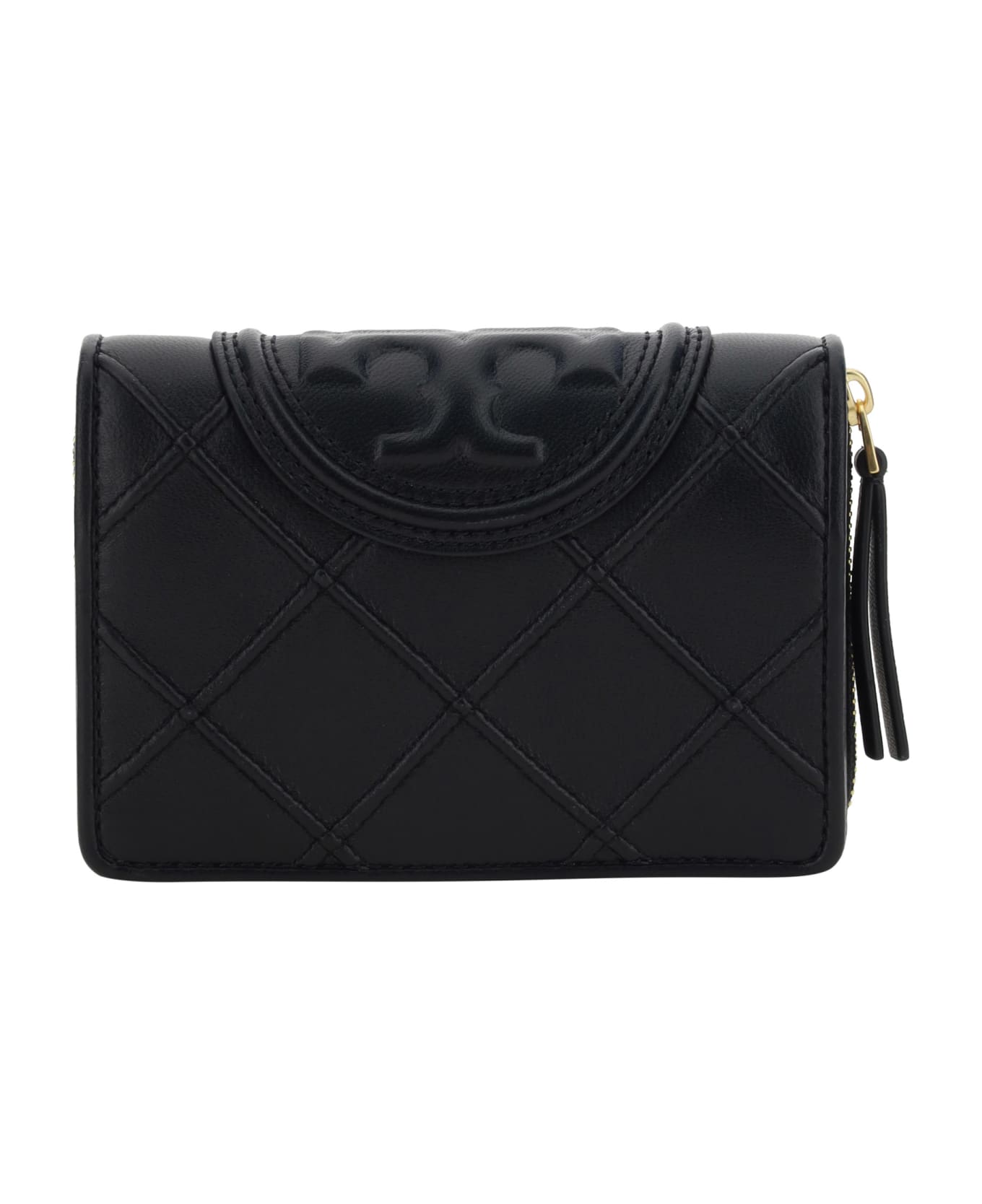 Lambskin wallet by tory burch, billfold design, zipped coin compartment, main compartment with press stud for closure, double card slots, banknote compartment, iconic brand monogram embossed on front.