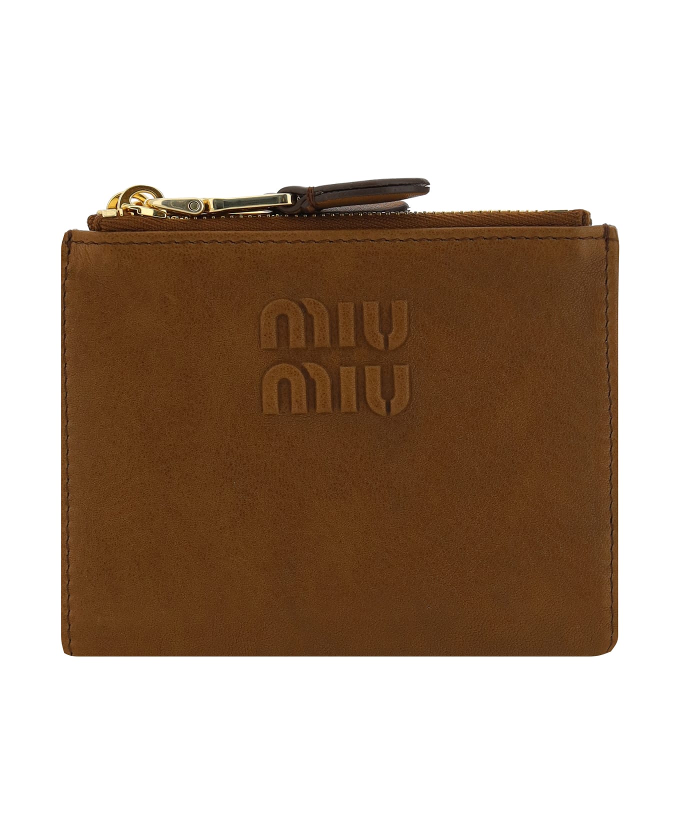 Calfskin wallet by miu miu, suede leather design, interior snap-button closure, double coin compartment with zipper for closure, matching iconic brand signature on front, iconic brand signature press-stamped inside, card slot, bill compartment.