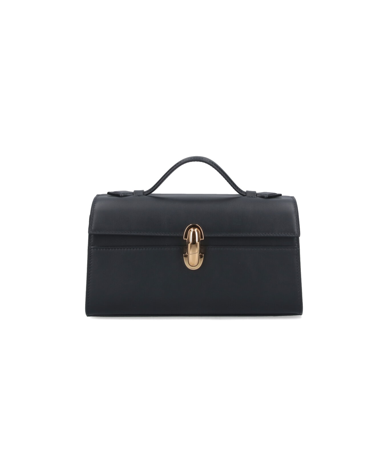 Savette 'Symmetry' black leather pouch with handle, turn-lock flap closure, gold logo print detail, inner flat pocket, one main inner compartment.