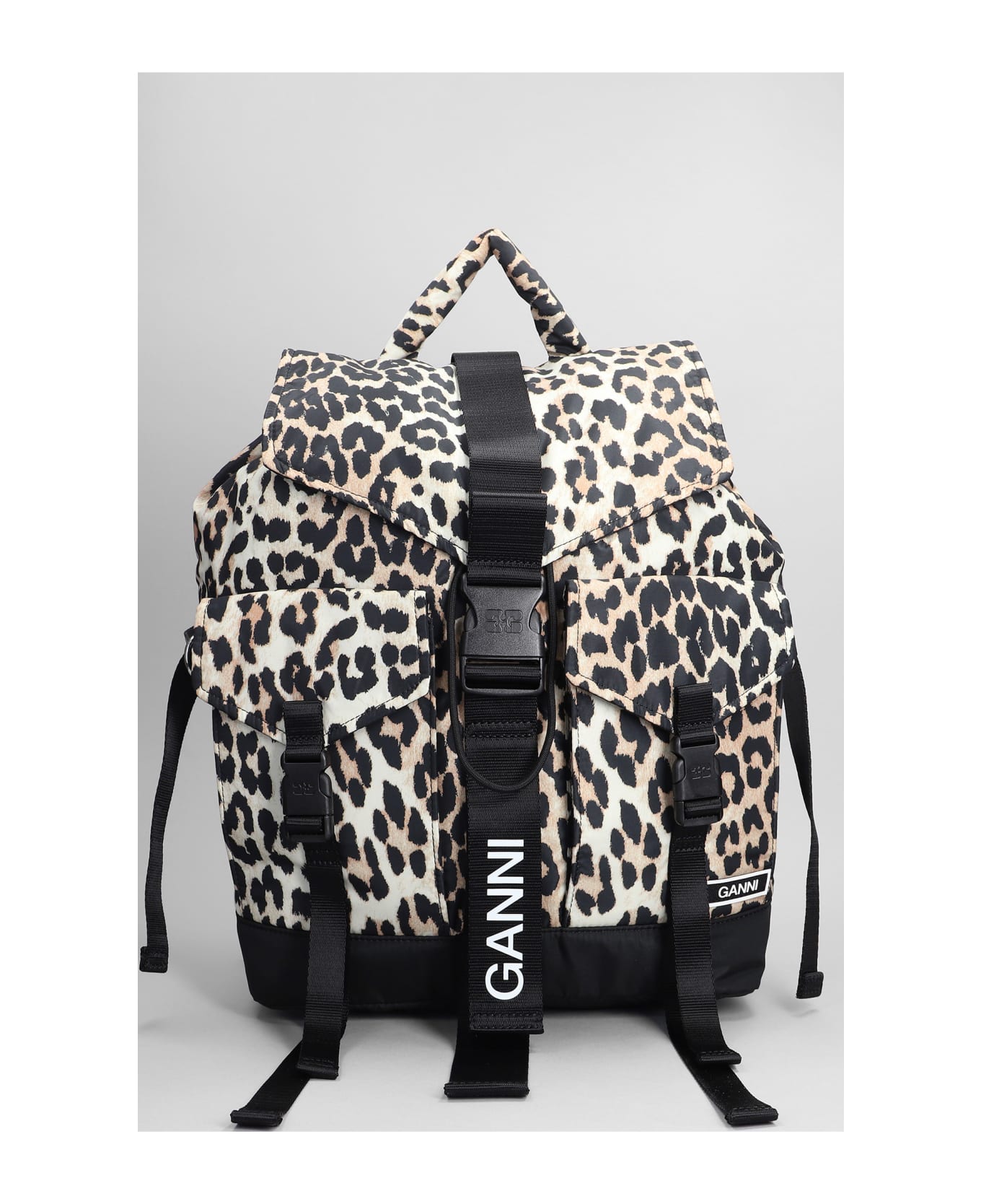 Backpack in Animalier polyester, handle, frontal pockets with flap, adjustable belt strap, adjustable shoulder strap, animalier print, Made in China, Height 205 mm, Width 320 mm