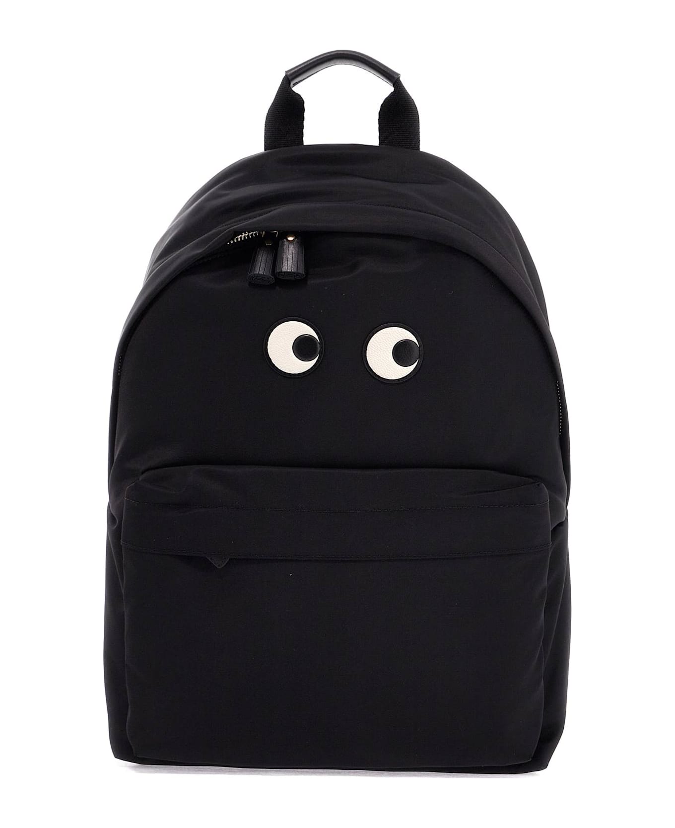 Anya Hindmarch backpack in Econyl regenerated nylon fabric with zip closure and the iconic Eyes patch in leather applied on the front. Adjustable shoulder straps, top handle, front zip compartment and side leather tag with gold-tone logo print. Nylon-lined interior with a flat pocket, gold-tone metalware.