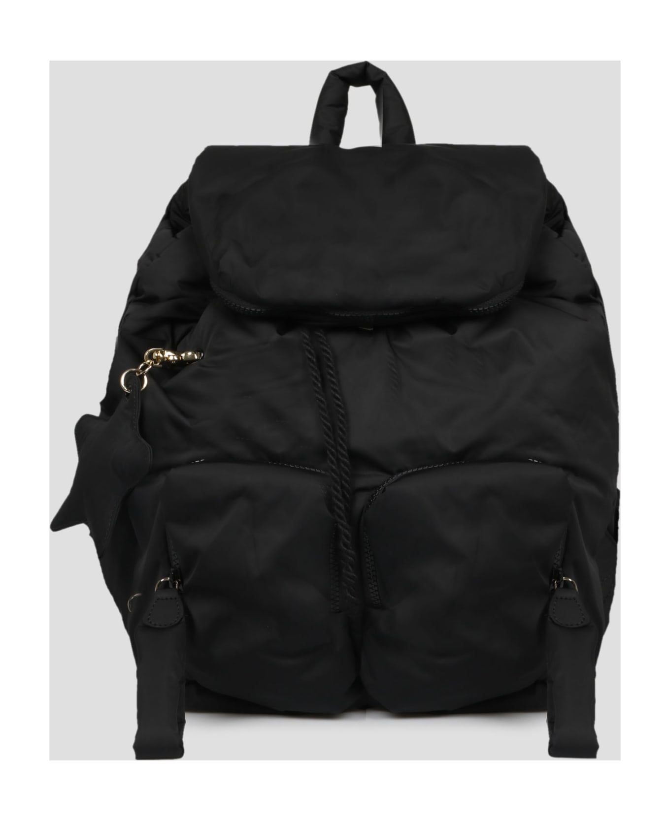 See by Chloè Joy Rider backpack, in nylon with removable star-shaped charm with embroidered logo. - SS23 - W: 30cm H: 37cm D: 18cm - Adjustable shoulder straps - Magnetic closure with flap and drawstring - One zip pocket on the flap - Two external zipped pockets - Interior: one zip pocket, two flat pockets - Made in India - 100% Polyamide