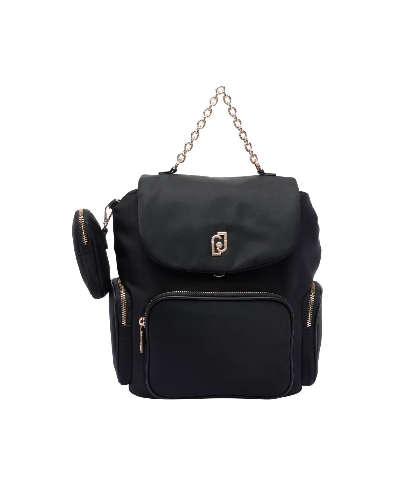 Liu Jo black Logo backpack, push lock closure, inner zipped pocket, open pocket, 3 external zipped pockets, 1 chain handle, adaptable straps, frontal golden logo Composition: 100% Polyamide