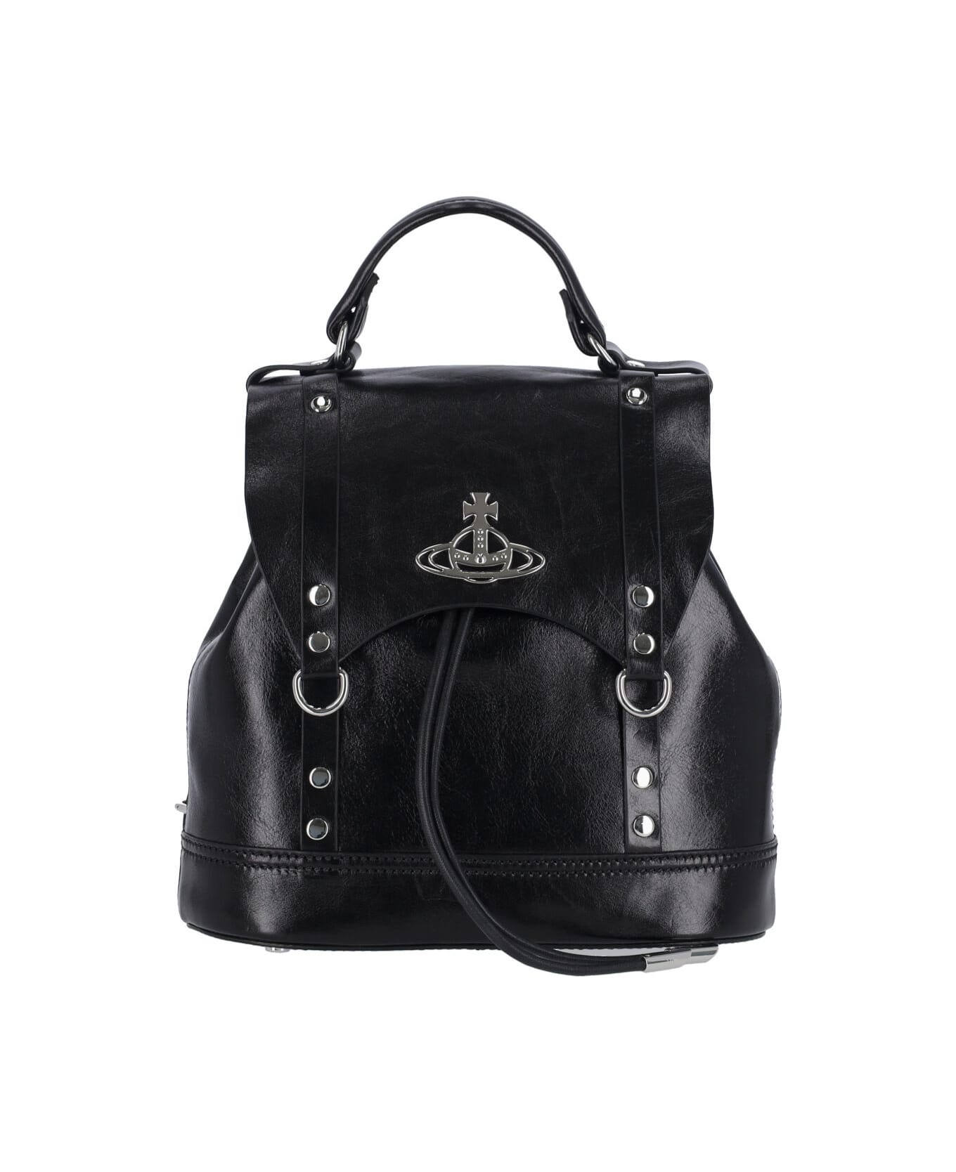 Vivienne Westwood 'Max' small backpack in black leather with handle, two adjustable back shoulder straps, magnetic strap and drawstring flap closure, silver metal 'Orb' logo detail, inner zip pocket, main inner compartment.