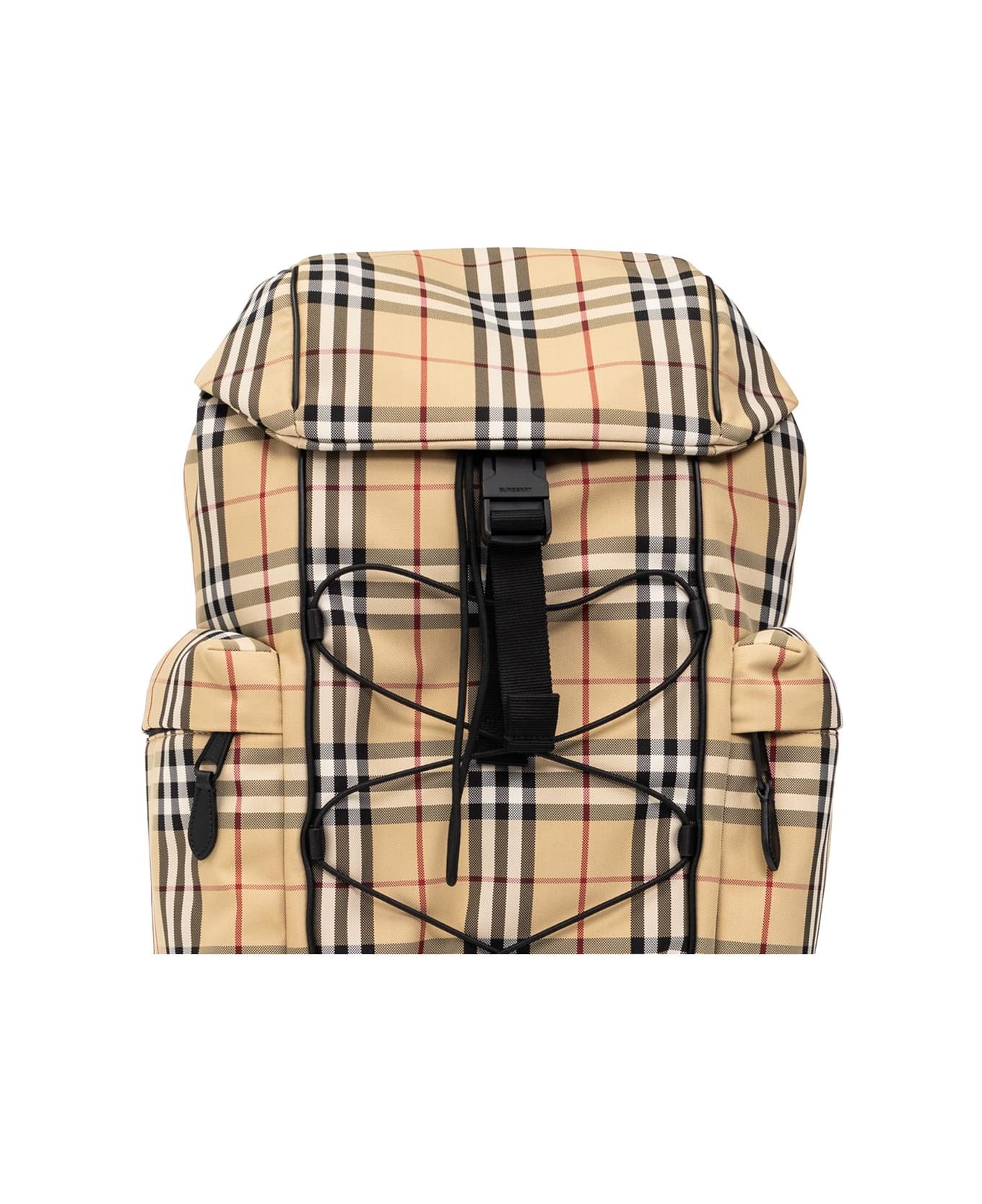 Beige 'Murray' backpack from Burberry. Made of canvas with the brand's signature check in white, black and red with calf leather trims, this model fastens with a snap button and is complete with decorative drawstrings, zip pockets on the sides, top handle