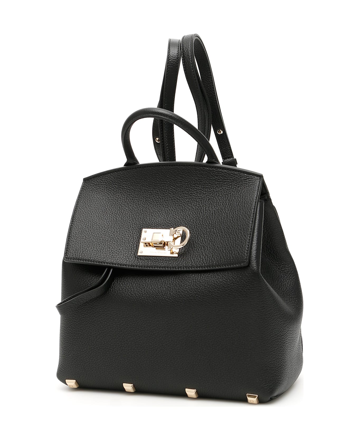 Salvatore Ferragamo grain leather backpack with Gancini closure on the flap. Top handle, adjustable shoulder straps, inside leather drawstring, base protective studs. Leather lining, inside zip pocket and two small pockets. Gold-tone hardware.