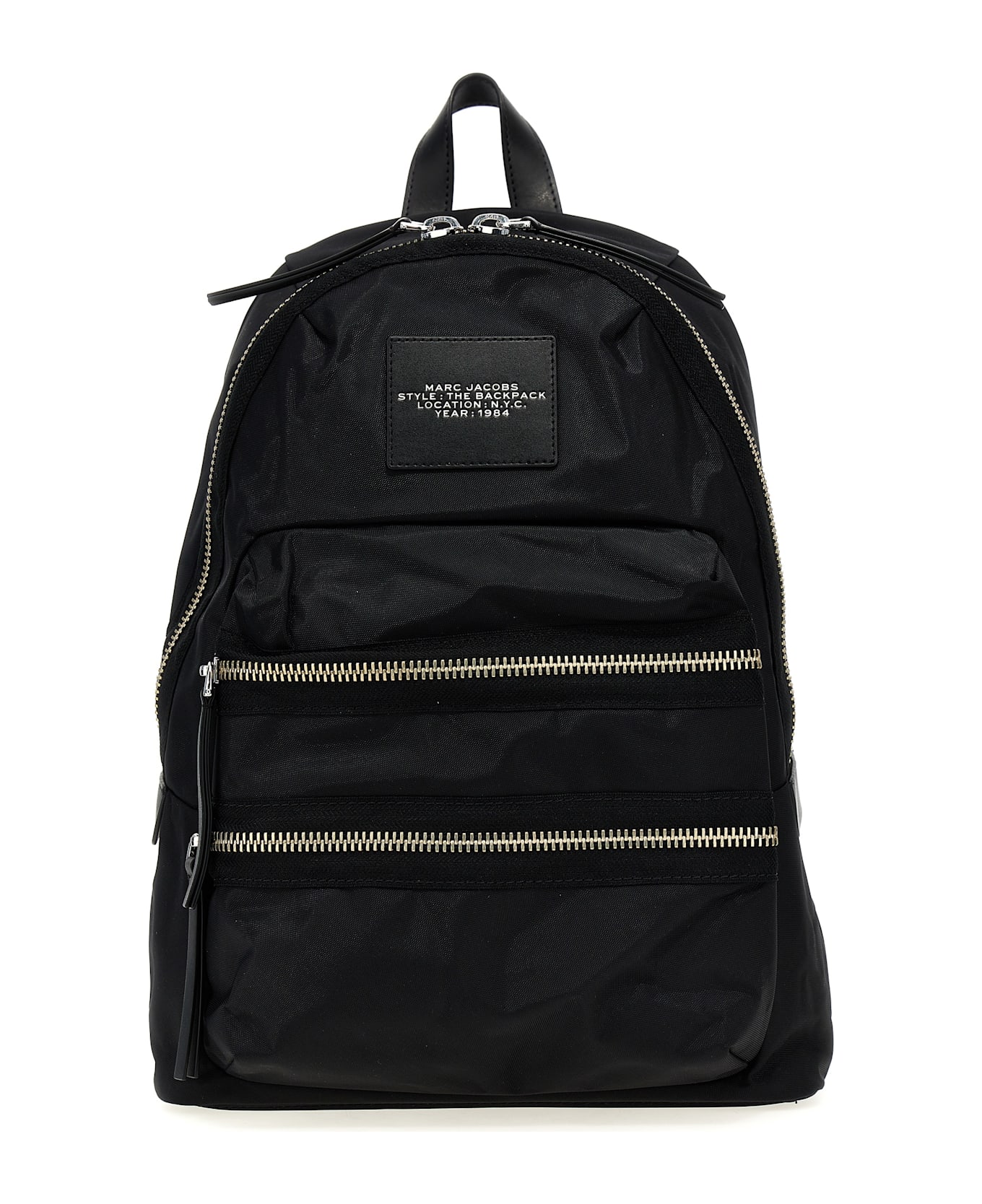 'The Biker Nylon Large' nylon backpack, front leather logo patch, zip closure, pockets, adjustable shoulder straps.