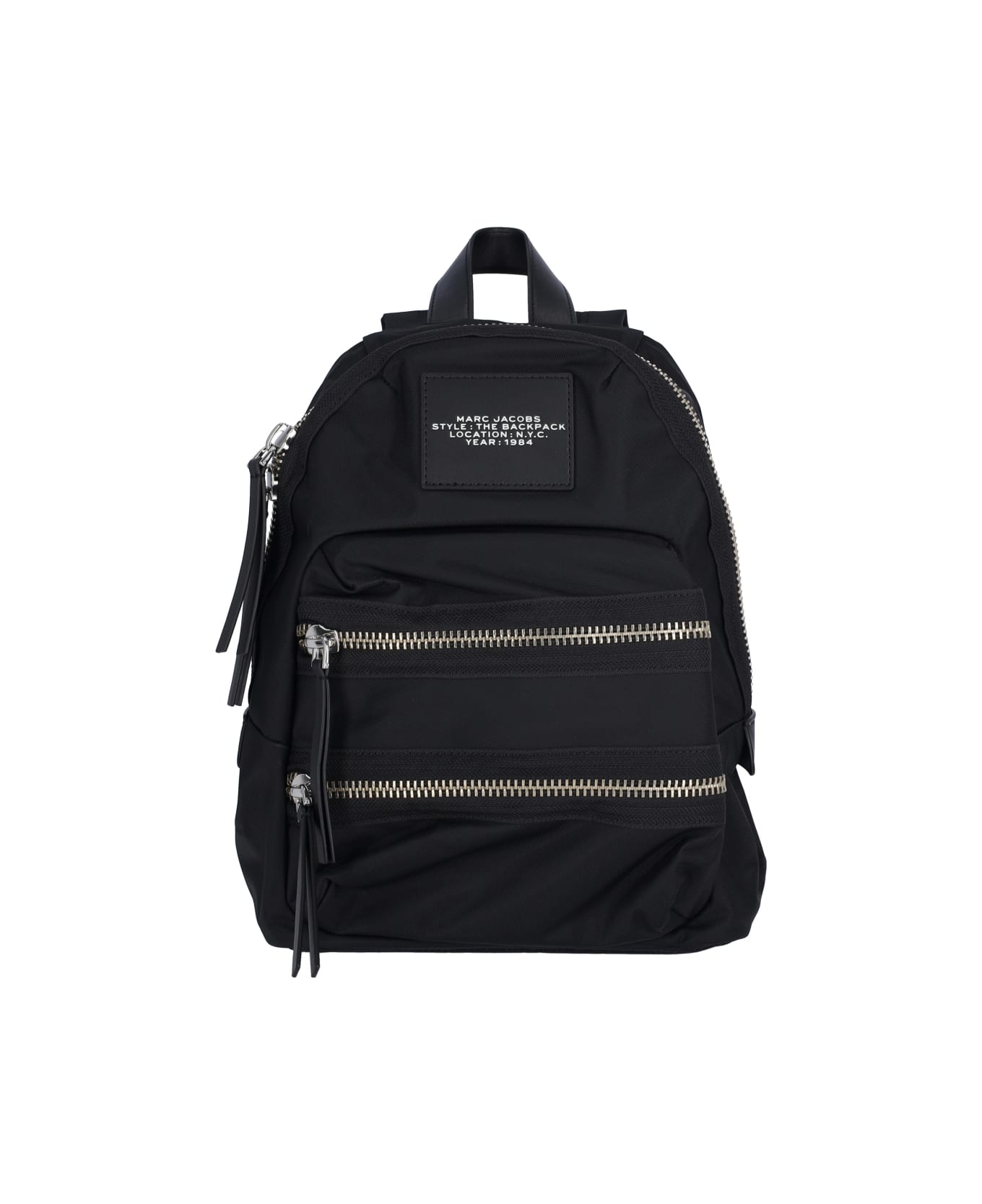 Marc Jacobs "The Biker Nylon Medium" black nylon backpack with top handle, adjustable shoulder straps, front logo patch, two front zip pockets, and main inner compartment. Composition: 100% Nylon