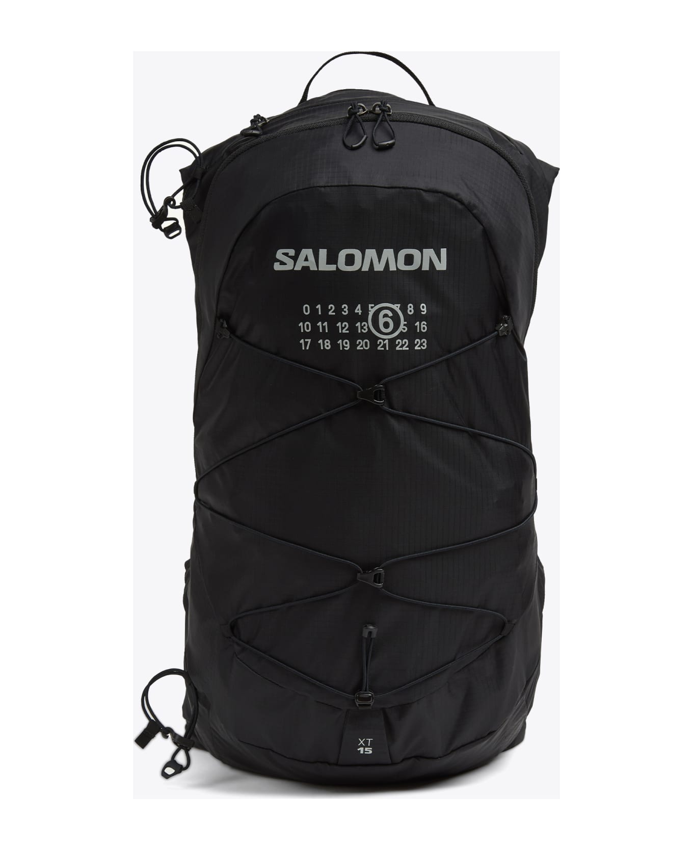 Black nylon backpack MM6 x Salomon with front logo. Zip closure. Adjustable shoulder straps.