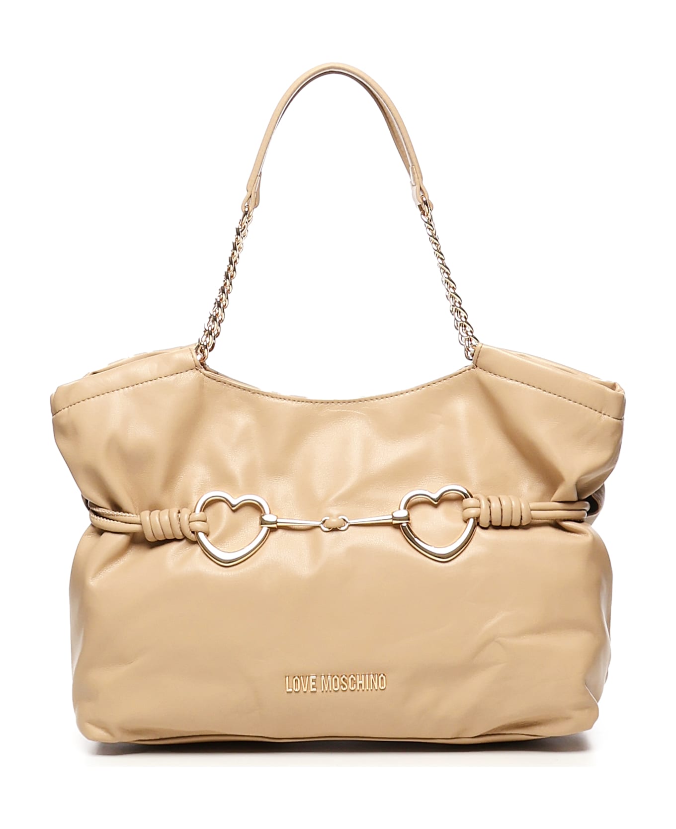 Double heart metal decorative element -Metal letter logo -Chain insert handles -Zip closure -Lined interior -Internal zip pocket -Color: Sand