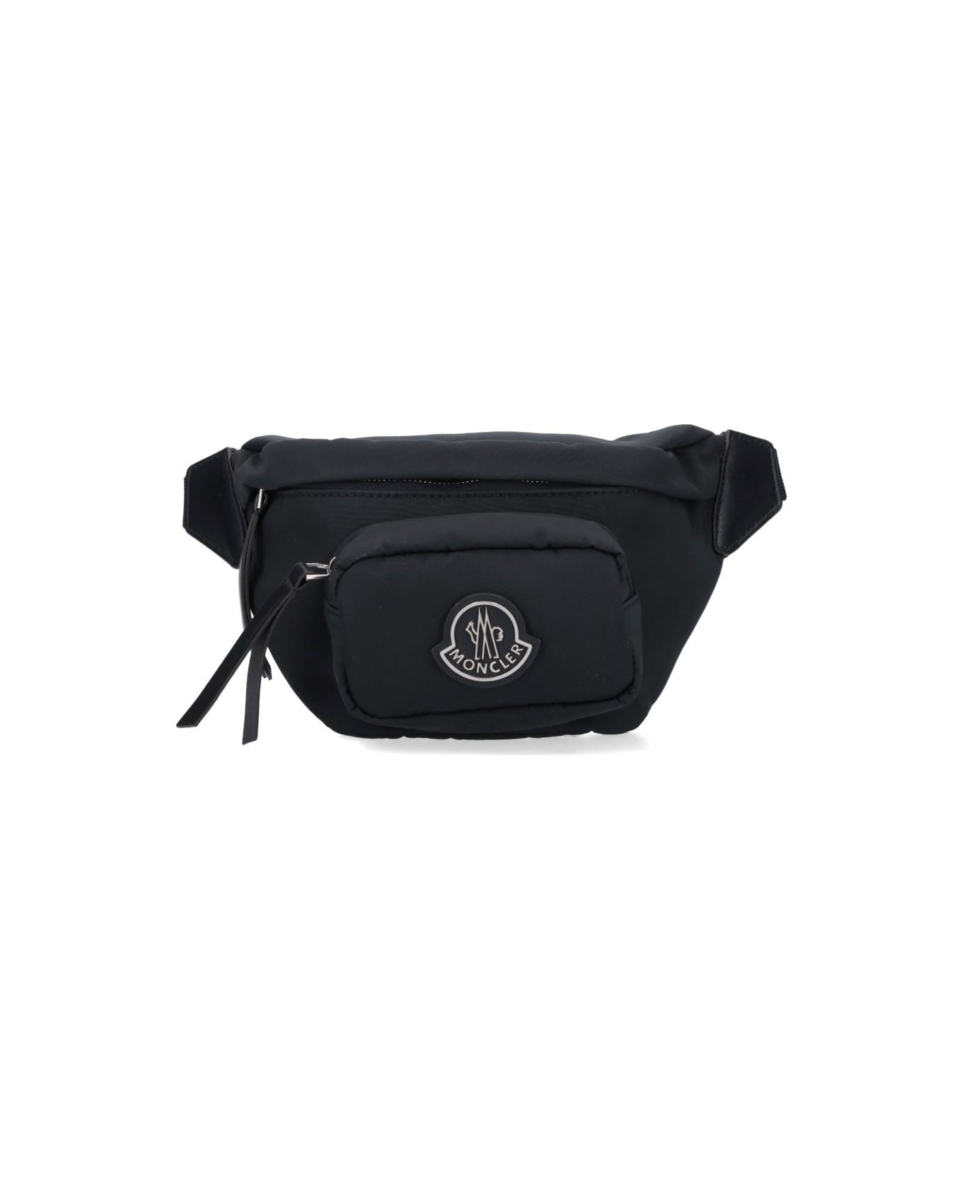 Moncler Felicie logo waist bag in black nylon drill, adjustable tape belt with back buckle, engraved logo detail, zip pocket with knotted zipper puller on the front, contrast logo patch detail, zip closure with knotted zipper puller, main inner compartment. composition: 100% polyamide