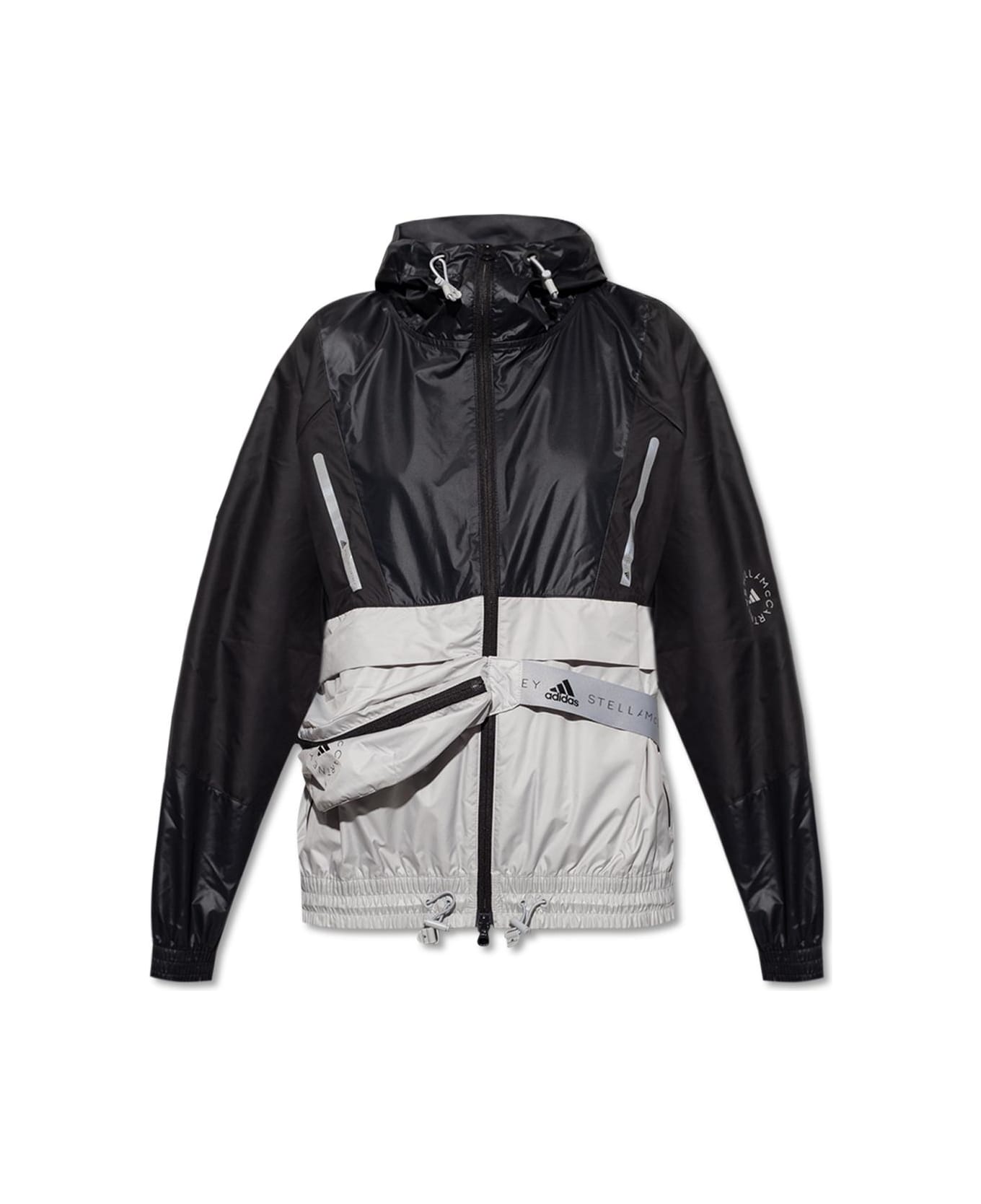 Grey and black jacket from ADIDAS by Stella McCartney, the 'Primegreen' line. Made of Primegreen, a series of high-efficient recycled materials fabric with 'WIND. RDY. ' technology that protects from the wind. Fastened with a two-way zip, this garment featu