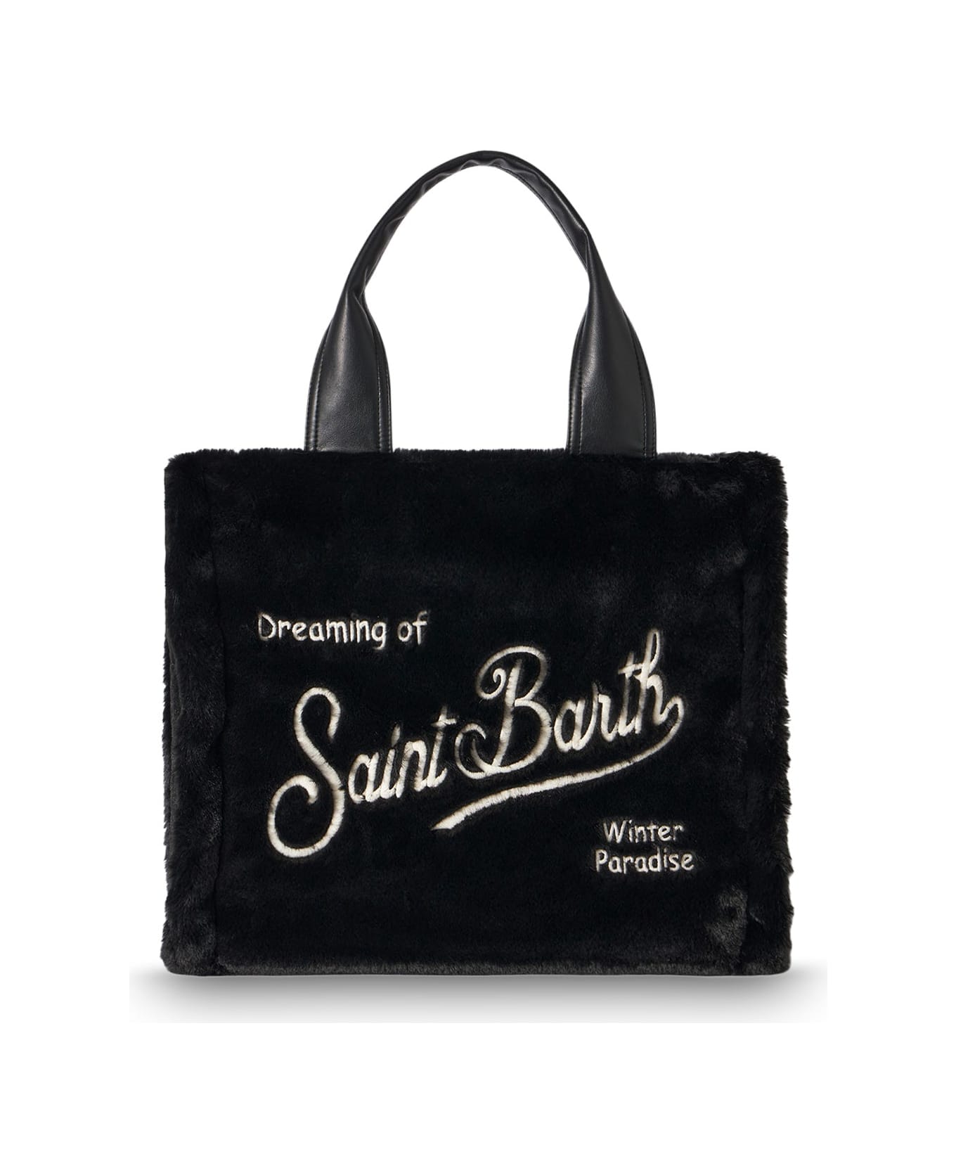 Black furry Flavea handbag with embroidery Fur effect Leather effect handles Black solid color Saint Barth logo front embroidery Unstructured look Sizes: 38cm X 36cm X 12cm