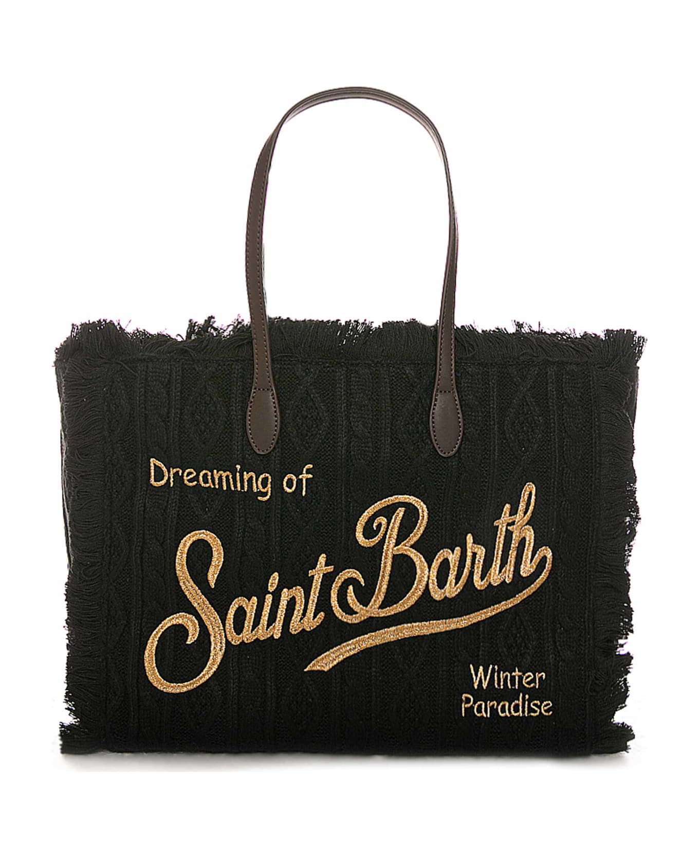 Vanity wooly black tricot shoulder bag Saint Barth golden front embroidery Eco leather handles Inside pocket with zip Sizes: 40 x 32 x 20 cm