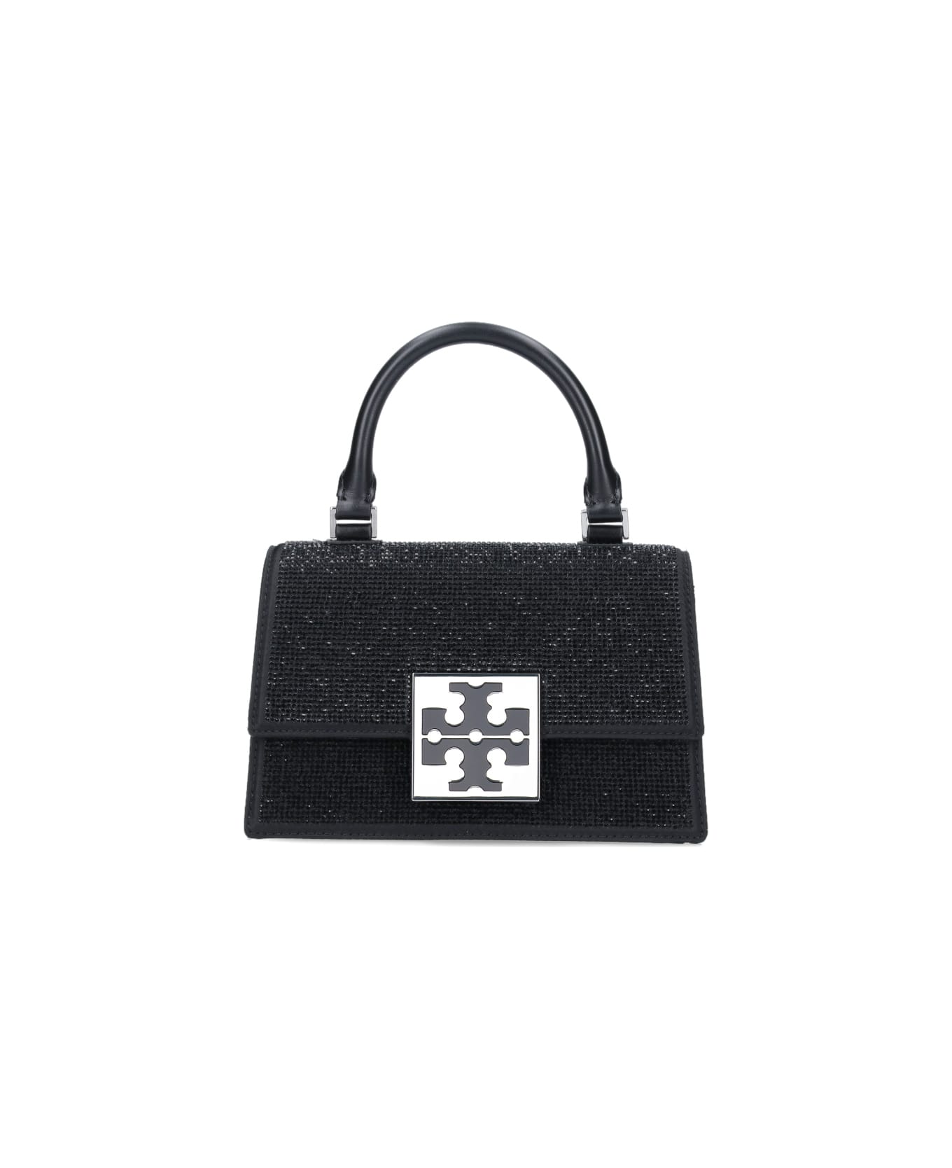Tory Burch 'Bon Bon' mini bag in black fabric with all-over tonal crystal details, rigid top handle, adjustable and removable shoulder strap, magnetic button flap closure, silver metal logo on the front, back slip pocket, two inner card slots, main inner compartment.