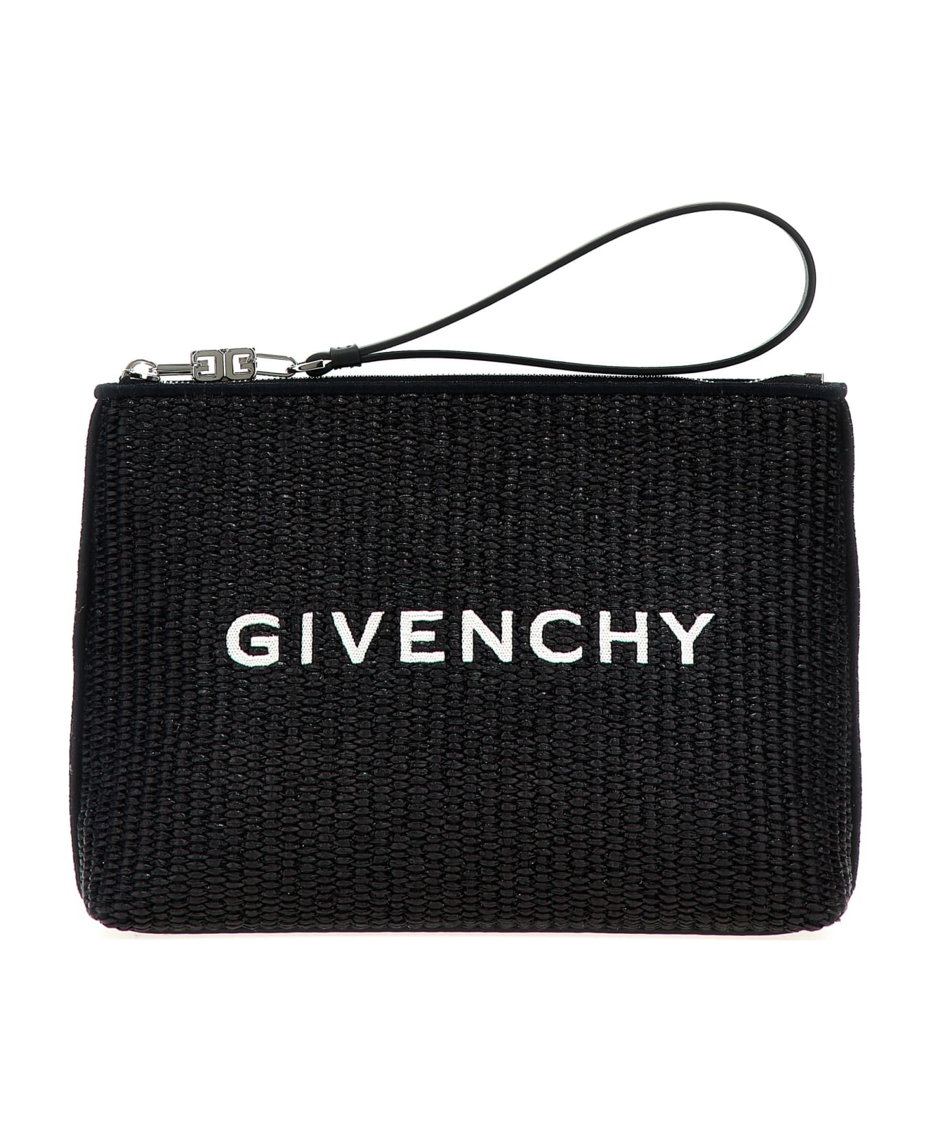 'Givenchy' raffia clutch bag with front logo embroidery, zip closure, leather puller.